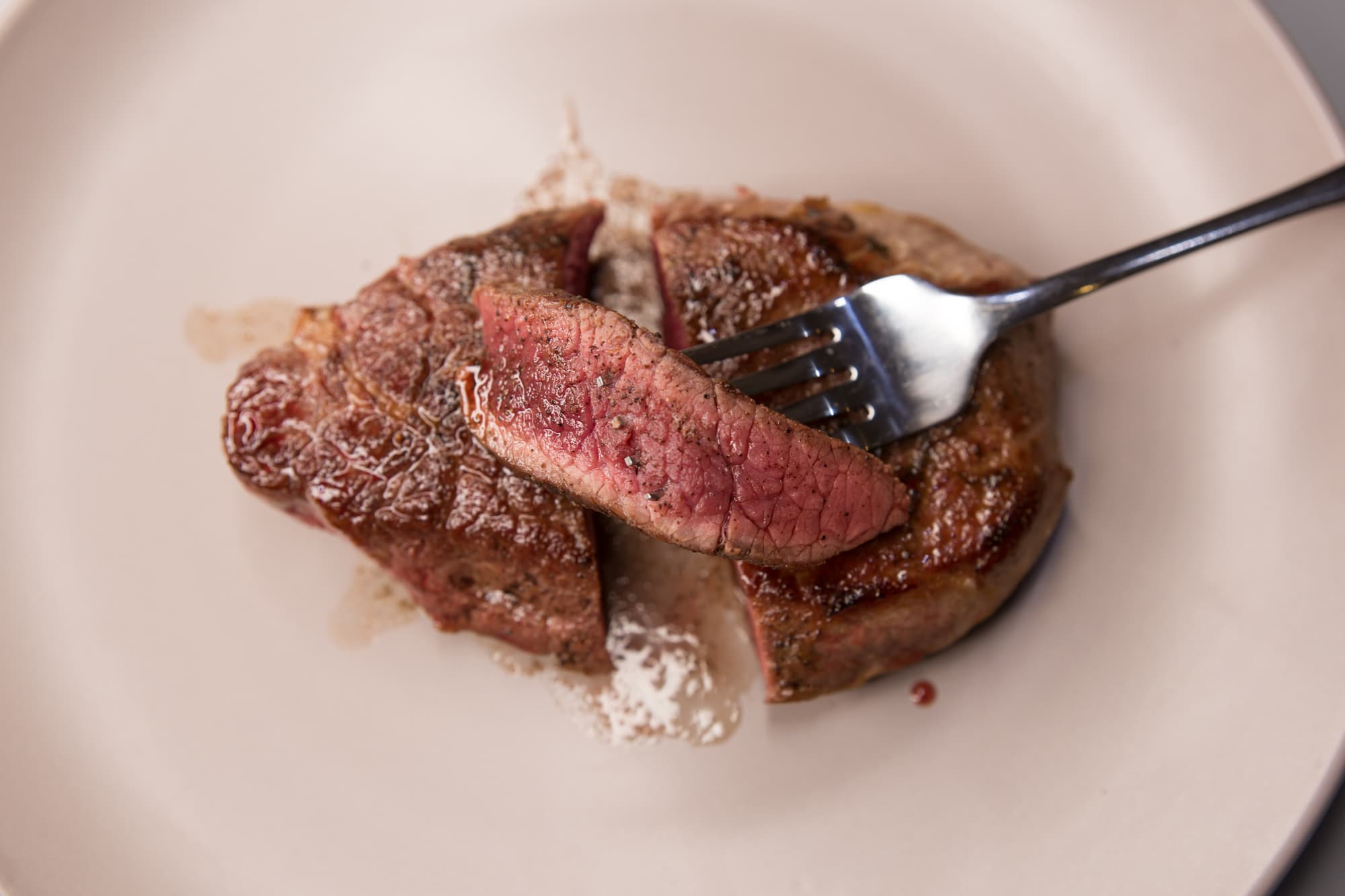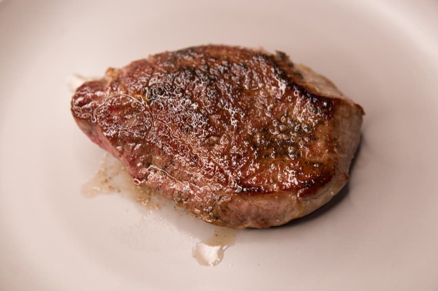 Выложили мясо на тарелку, с обеих сторон поперчили и посолили, накрыли фольгой и оставили ненадолго отдохнуть. Так у нас получился уверенный medium rare.