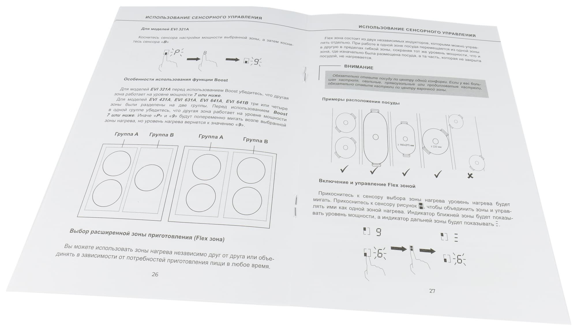 На панели свободно размещаются две емкости диаметром 24-25 см, на остальные зоны в таком случае можно ставить еще пару диаметром до 20 см. Размещение конфорок относительно всей поверхности рассчитано так, чтобы посередине оставалось достаточно свободного пространства.