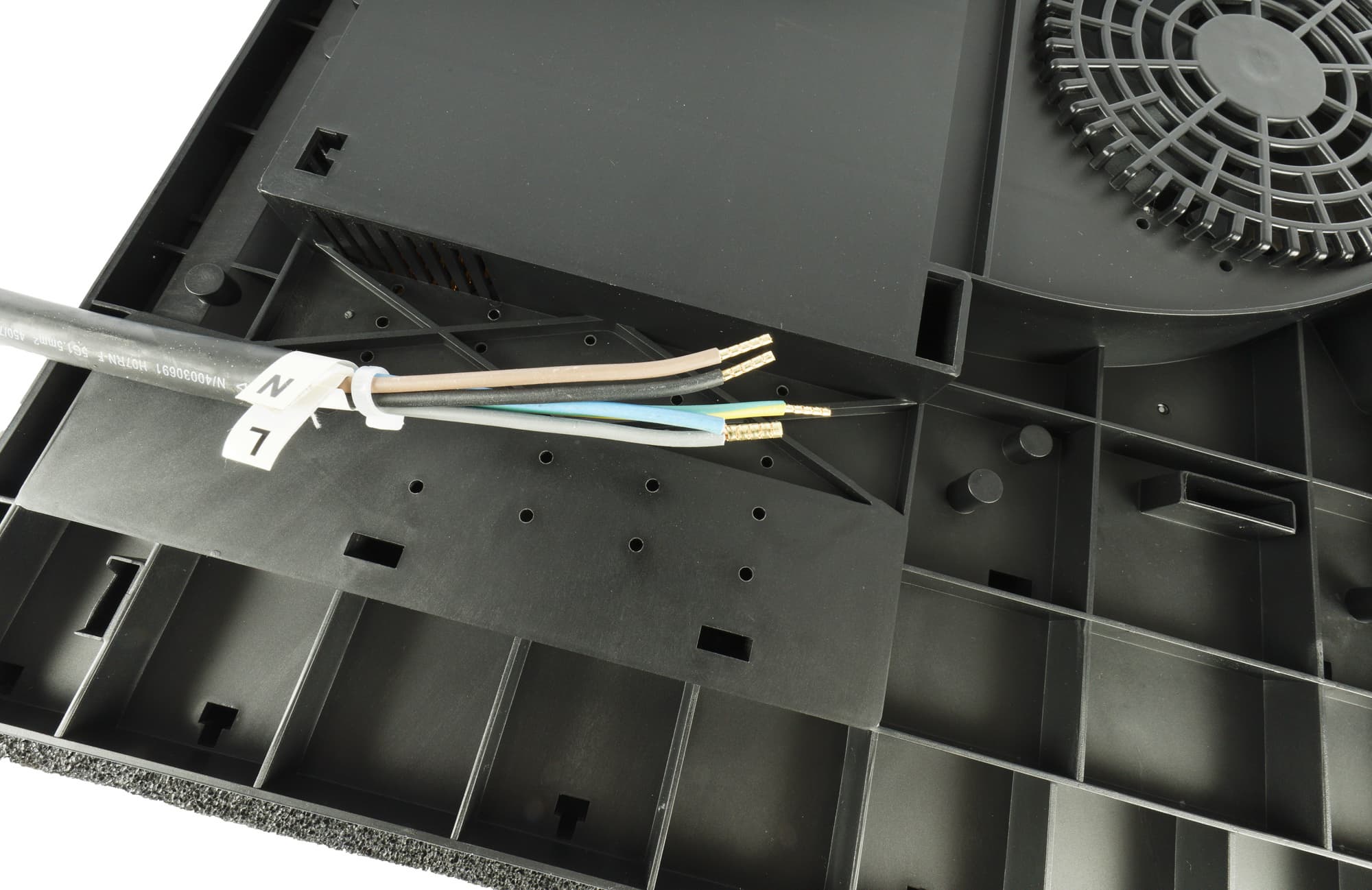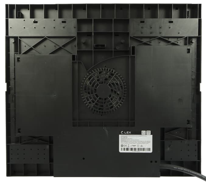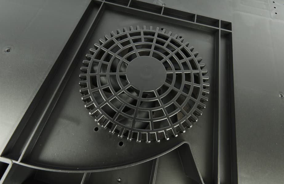 Нижняя часть корпуса выполнена из пластика. По периметру панели вклеена поролоновая вставка. На дне, по центру, мы видим решетку вентилятора,