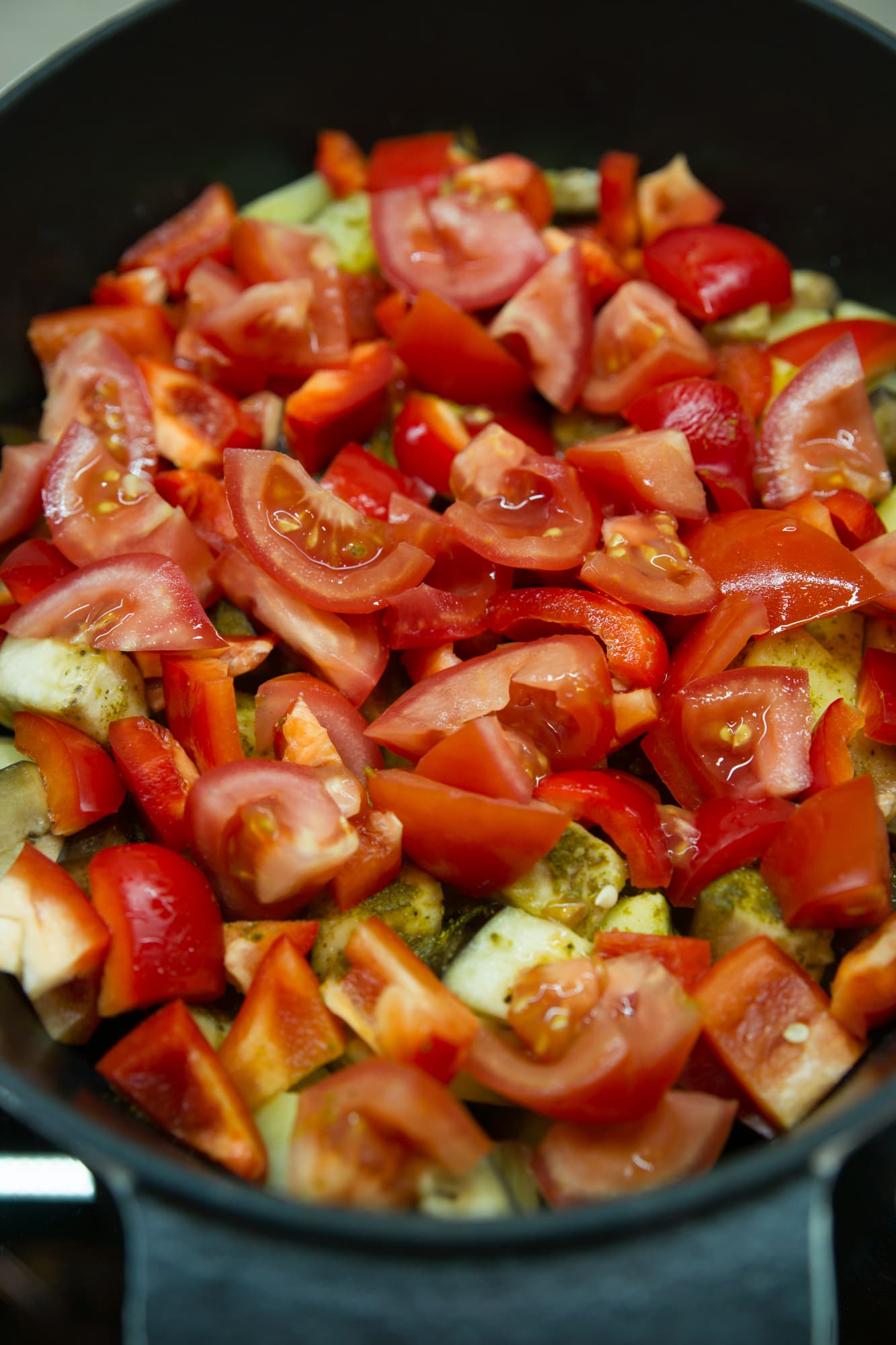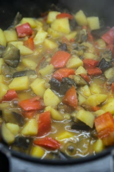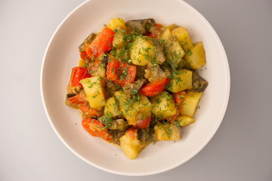 Для начала объединили две левые конфорки, поставили на них большую чугунную емкость и включили 4-й уровень нагрева. Налили немного растительного масла и слоями выложили нарезанные кубиками баклажаны и картофель, добавили к ним несколько зубчиков чеснока, мелко нарезанные болгарские перцы и помидоры. Каждый слой, чередуя, посыпали солью и хмели-сунели. Блюдо тушилось под закрытой крышкой. Через полчаса снизили нагрев до 3, перемешали овощи и оставили на плите еще на 40 минут.