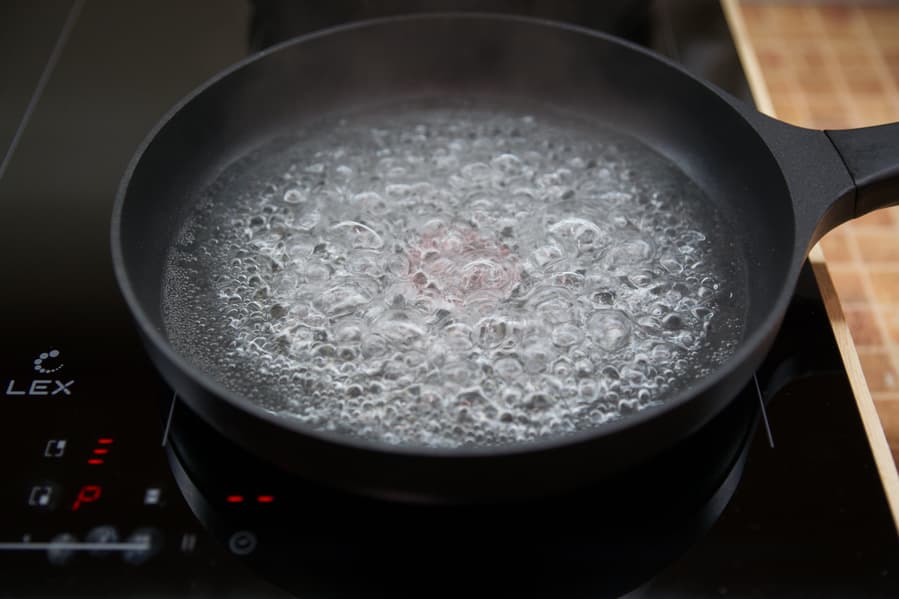 Для определения размера нагревательных элементов мы поставили на плиту емкость большого размера, налив в нее немного воды. Через несколько секунд придонные пузырьки обозначили конфигурацию нагревательного элемента — круг с ровными краями без пустот по центру. Диаметр круга на всех четырех конфорках — примерно 19 см.
