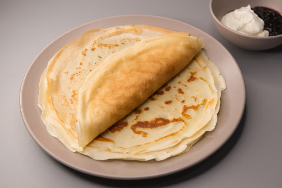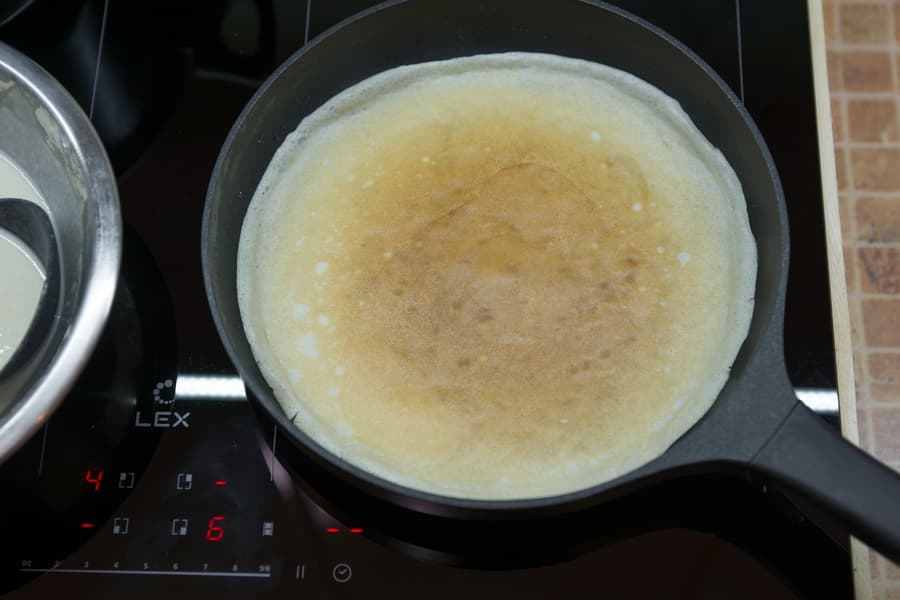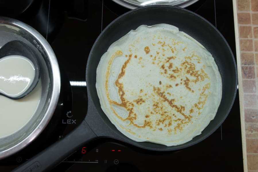 Ингредиенты: кефир — 180 г, молоко — 180 г, блинная мука — 160 г, растительное масло — 1,5 ст. л., сахар — 2 ст. л., щепотка соли, 2 яйца
