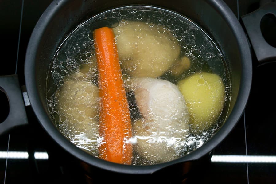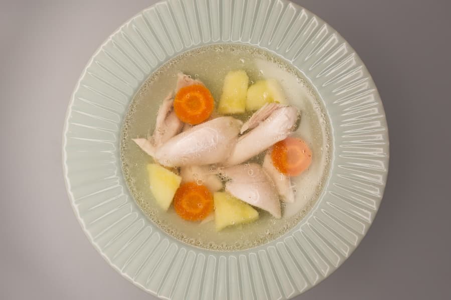 Температура бульона снизилась до 90 °C и стабильно держалась на этом уровне основную часть времени. В середине процесса в бульон целиком были добавлены морковь и пара картофелин.