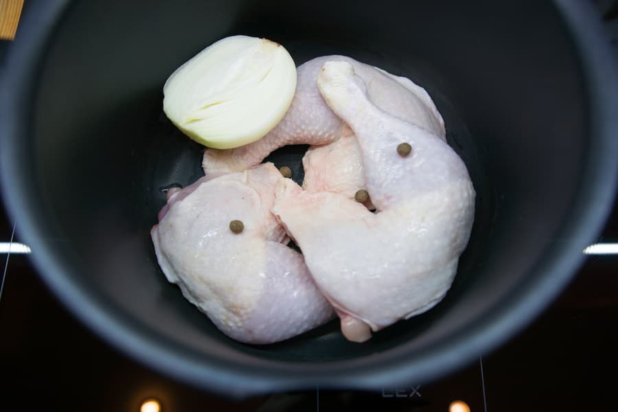 В кастрюлю положили три окорочка, половину луковицы, залили 2,5 л воды, добавили горошины черного душистого перца, посолили и включили Boost. Через 18 минут вода закипела. Убрали пену, поместили в бульон термощуп с ограничением в 93 °C и уменьшили нагрев до 5.
