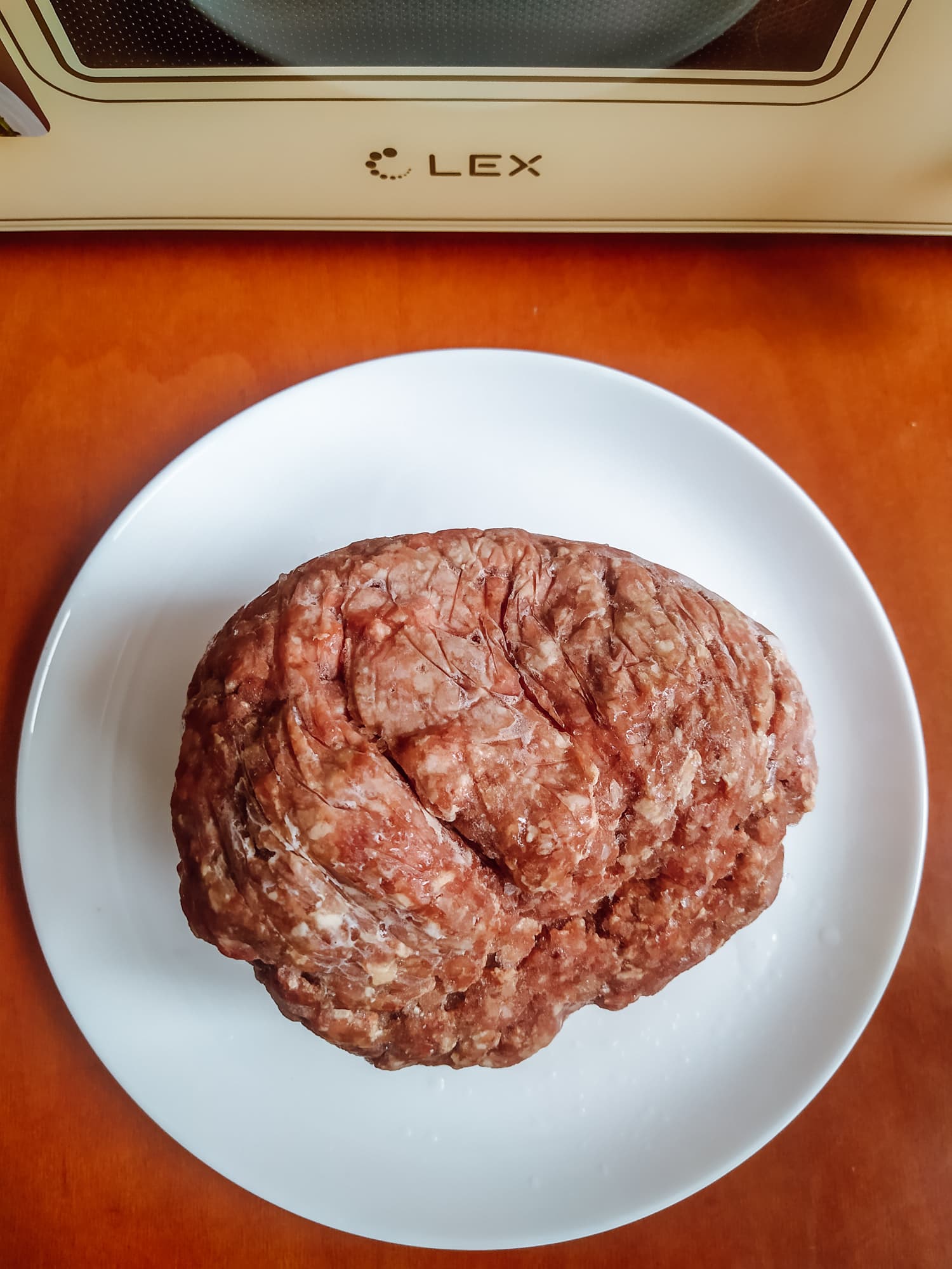 Инструкция советует размораживать килограмм мяса 26 минут. Хоть наш подопытный чуть легче, мы установили рычажок таймера на отметку 26, но параллельно включили секундомер, чтобы отследить точное время разморозки. Если вес размораживаемых продуктов превышает 500 г, Lex советует переворачивать их как минимум 2 раза, так что уже через 7 минут мы открыли камеру. Фарш возвышался над небольшой красноватой лужицей, сверху еще не сошел весь иней, а внизу уже появился маленький участок запекшегося мяса. Очевидно, переворачивать нашего подопытного нужно куда чаще. Мы соскребли с поверхности 40 граммов оттаявшего мяса и вернули тарелку в печь.