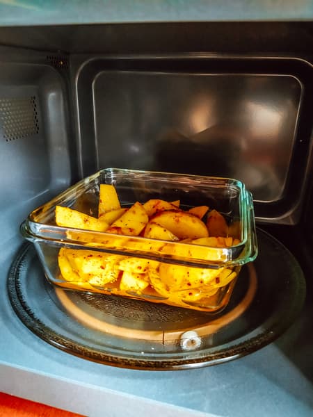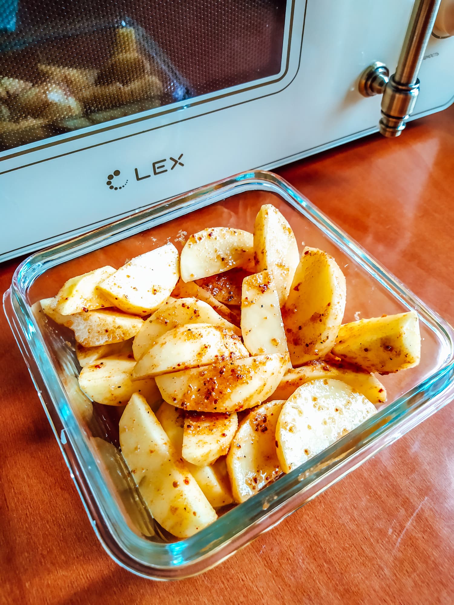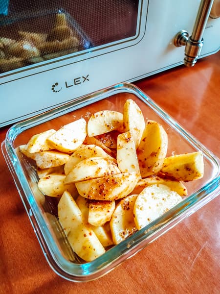 Нарезанный дольками картофель мы залили растительным маслом, сдобрили специями и поставили запекаться на максимальной мощности.