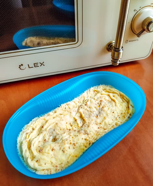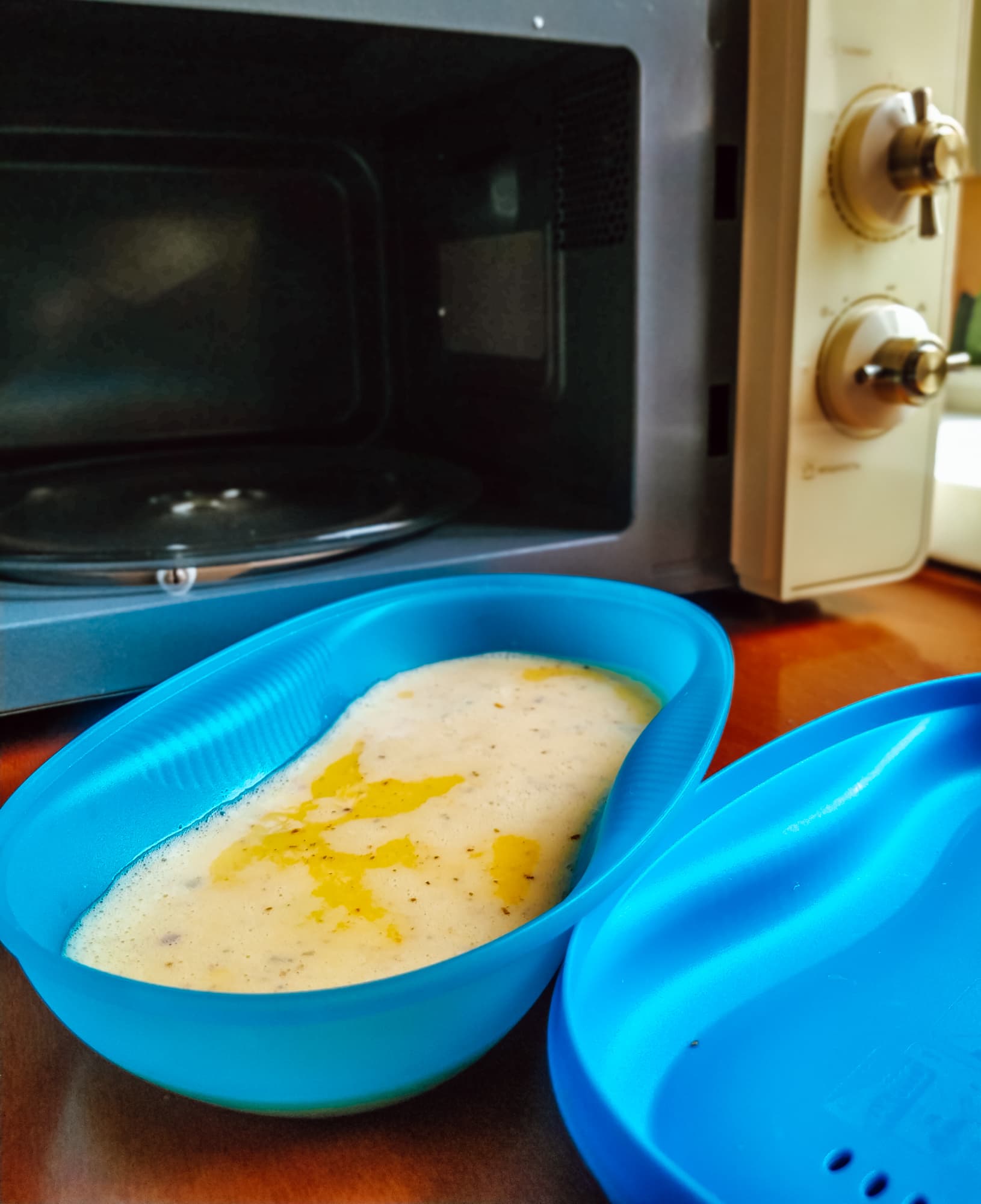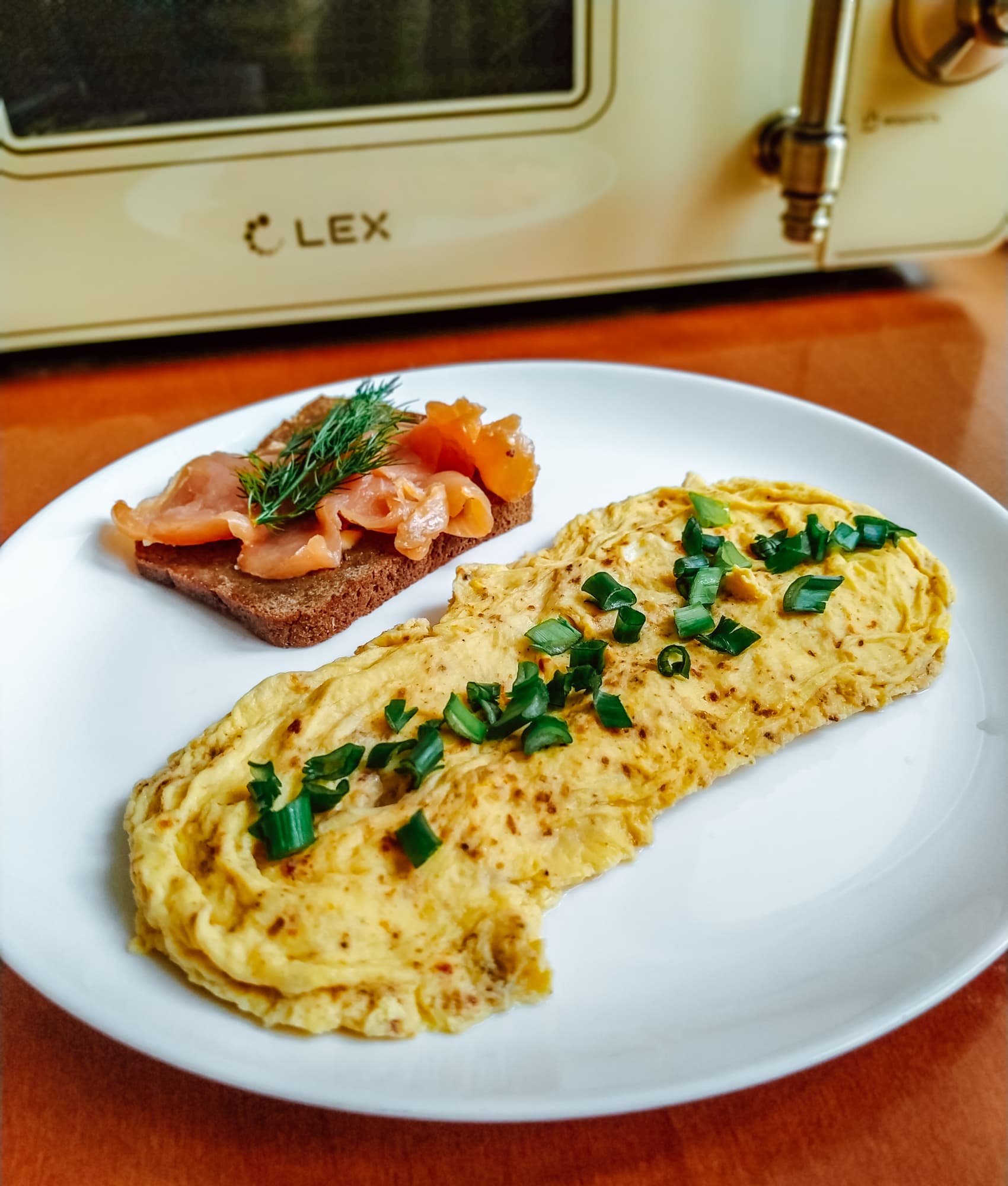 Другой классический вариант завтрака — яичница-болтунья. Льезон из двух яиц, молока и специй мы залили в специальную посудину для СВЧ-печи, накрыли крышкой и отправили в Lex FSMO M.03IV на высокой мощности на 2,5 минуты.