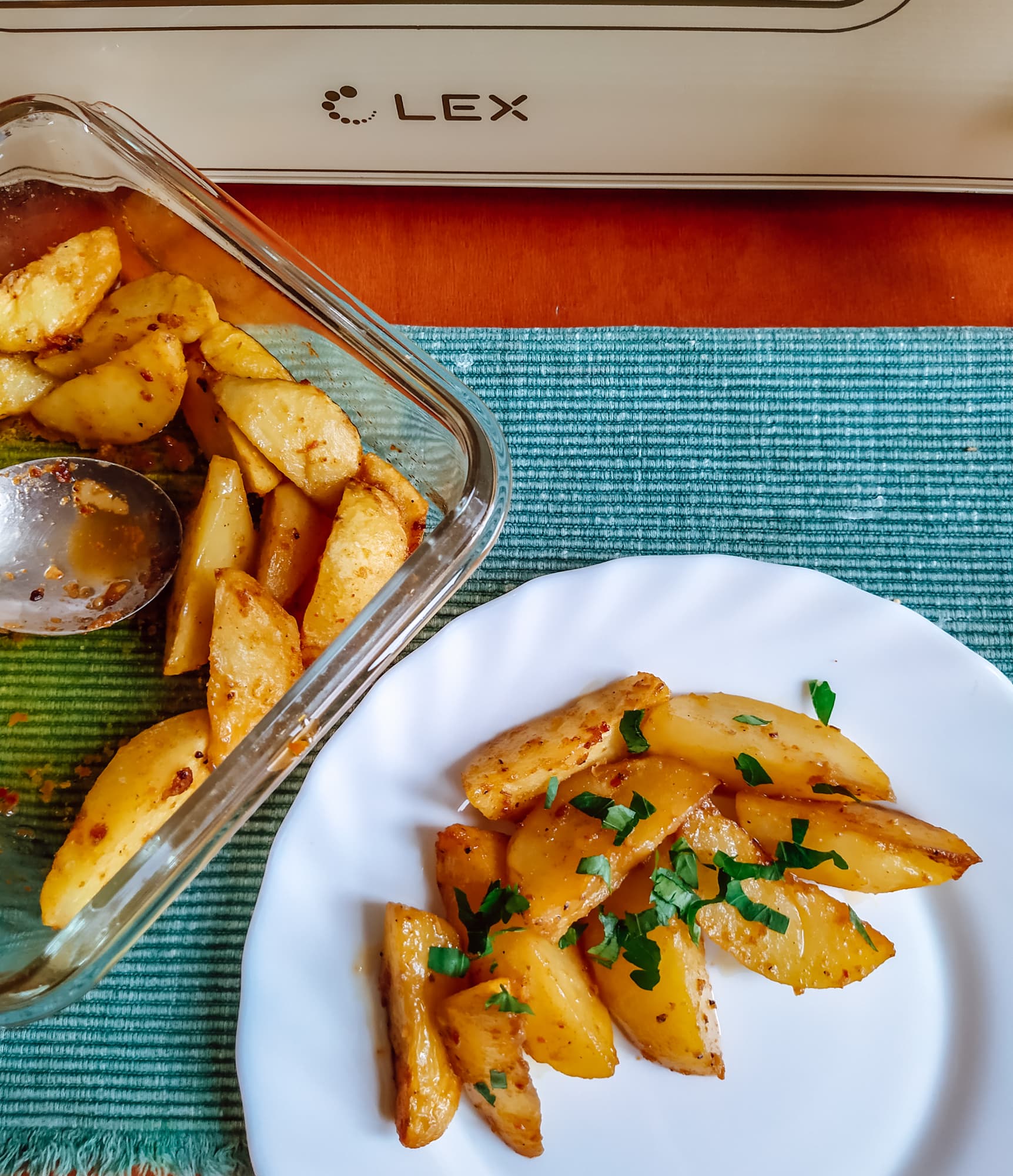 Через 6 минут перемешали картошку. Сверху она уже была мягкая, но внутри дольки оставались сырыми. Снова отправили их в печь доходить до кондиции.