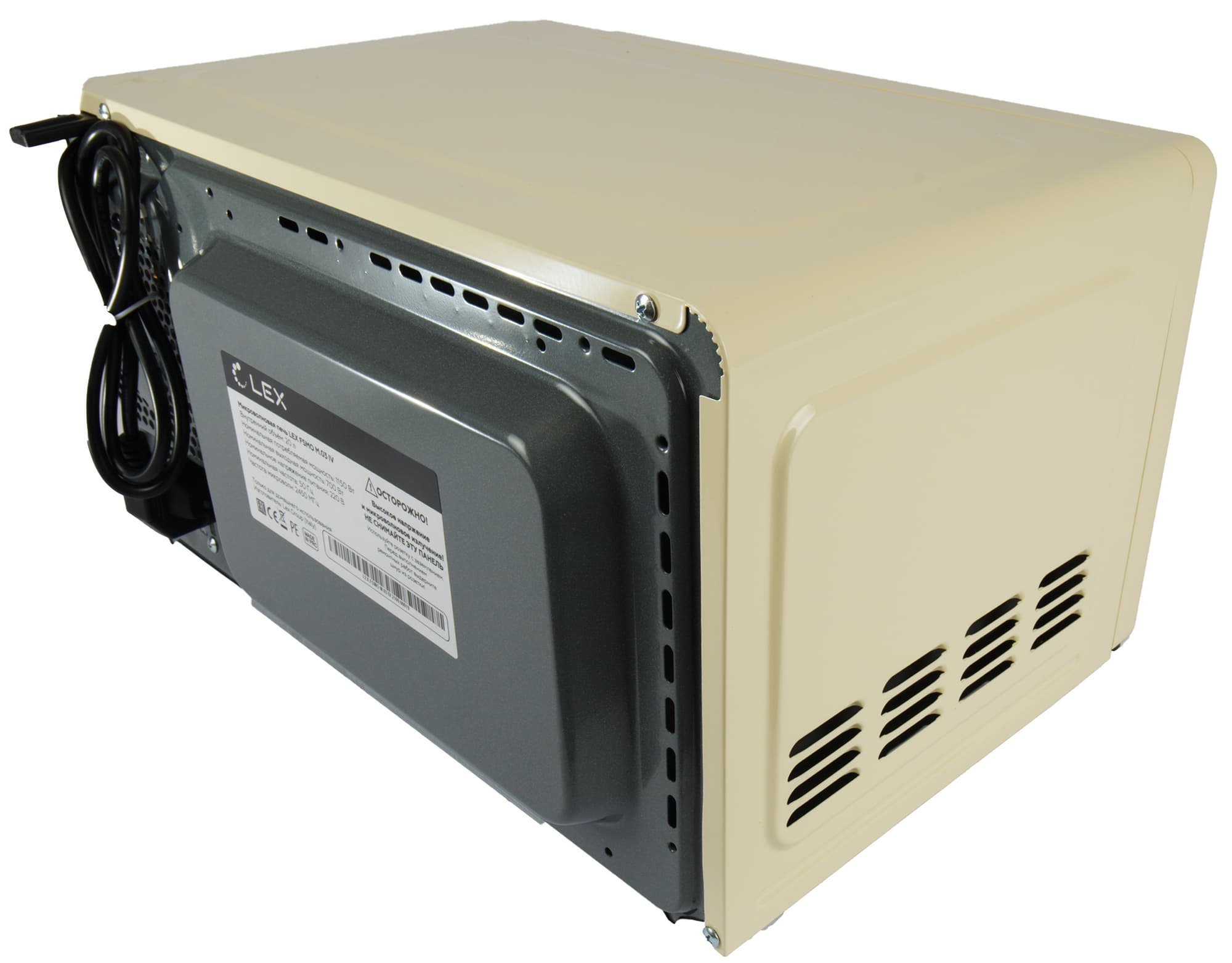 Сзади — технические и вентиляционные отверстия, выступ, не позволяющий прислонить печь к стене, шнур с ограничителем и шильдик с технической информацией. С левого бока печи поверхность гладкая, а вот на правом есть вентиляционные отверстия.
