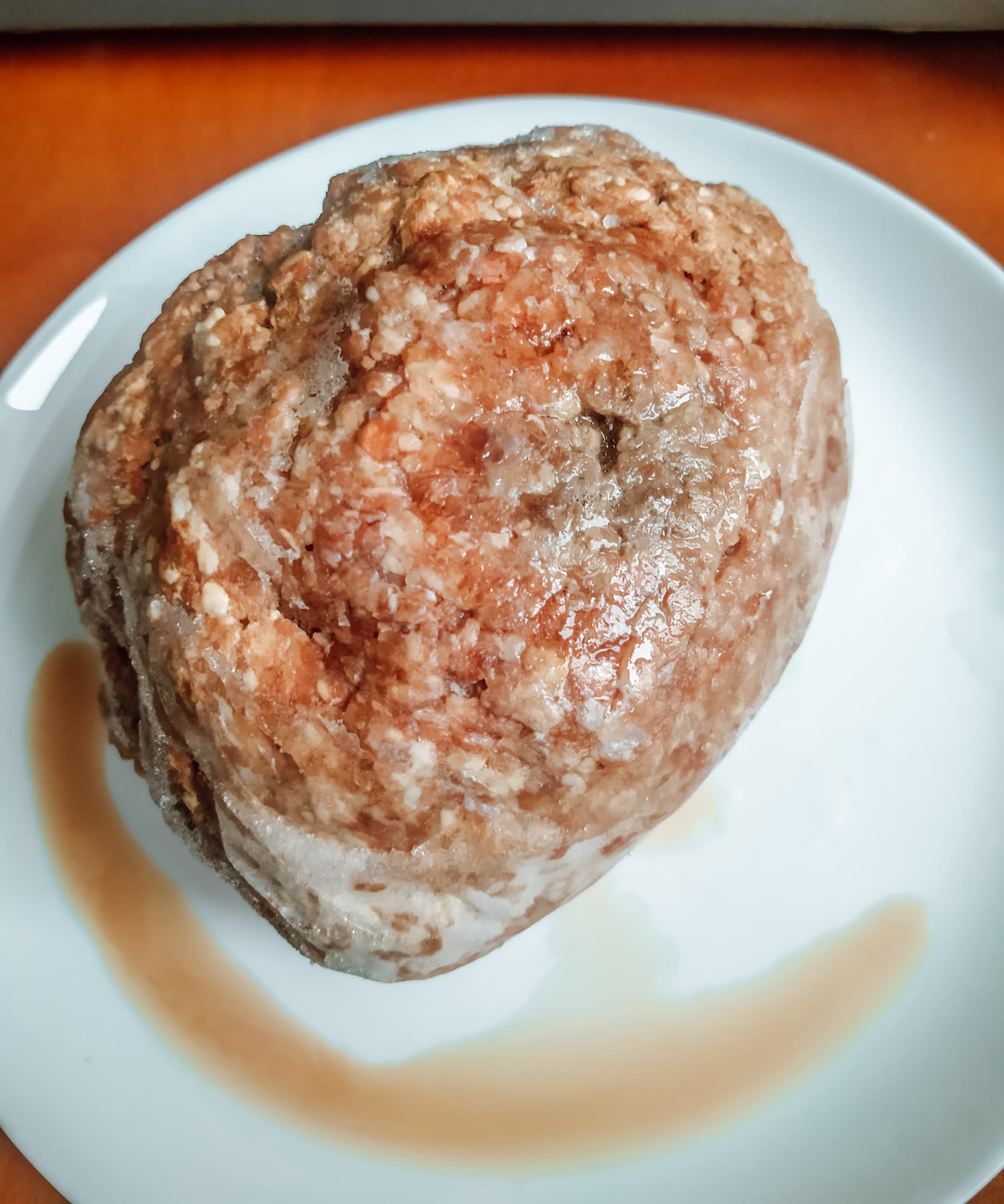 Второй раз мы прервали процесс через пять минут — поверхность нашего шара очень сильно нагрелась, и снова внизу обнаружился небольшой участок с явными признаками денатурации белка. С этого момента мы не оставляли фарш в печи дольше трех минут, постоянно соскребая с его поверхности то, что уже разморозилось. После таких коротких итераций он выглядел замечательно сырым.