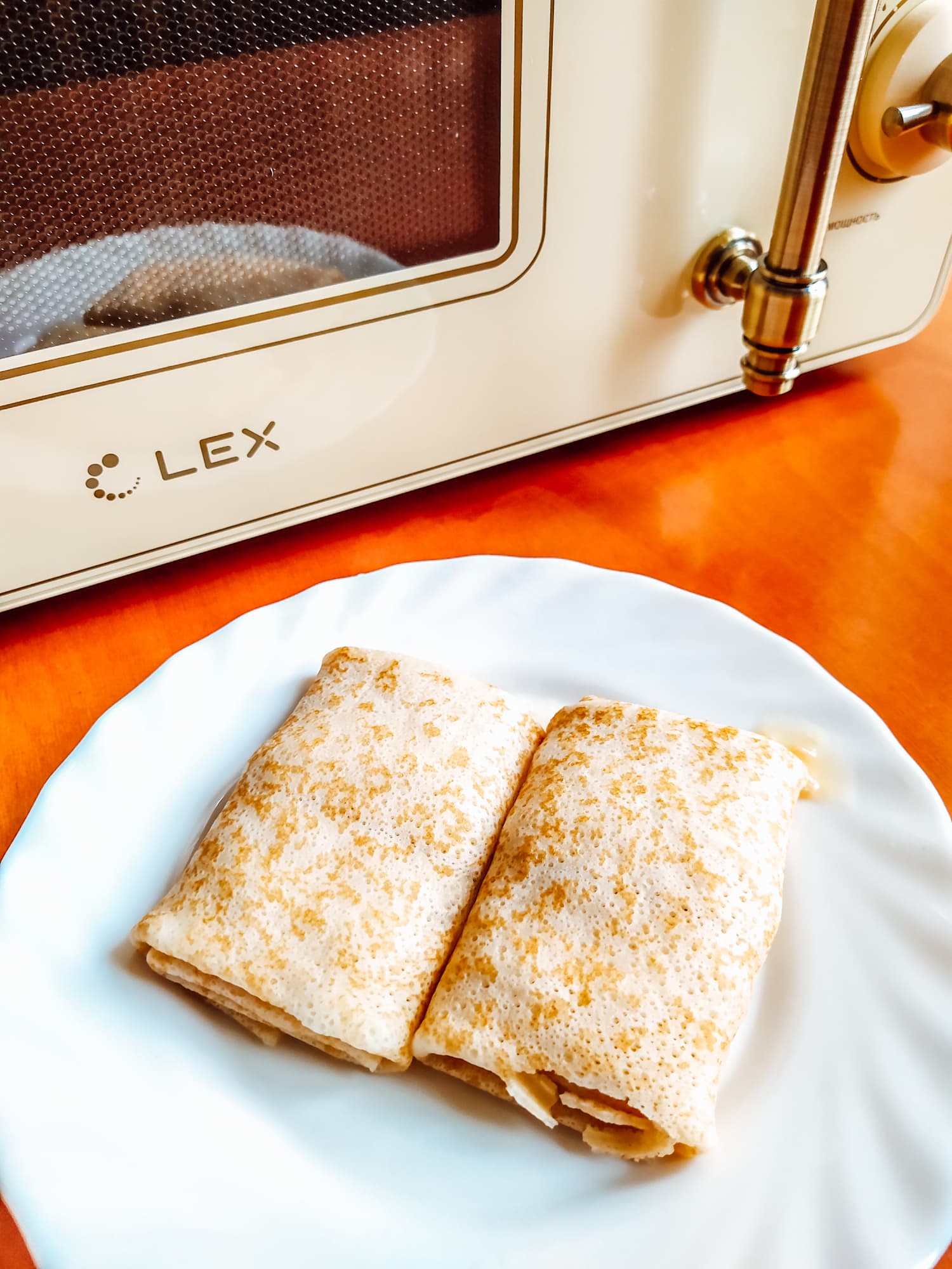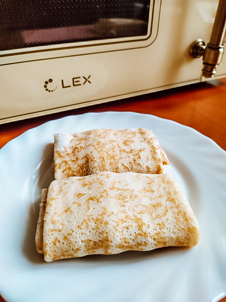 Хоть мощность Lex FSMO M.03IV, согласно инструкции, чуть ниже, блинчики были полностью готовы через две с небольшим минуты. Блины нагрелись на удивление равномерно, а сыр в начинке успел полностью расплавиться, но не перегреться.