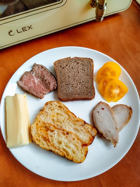 Гениальное изобретение человечества — горячие бутерброды. Просто, вкусно, а благодаря микроволновкам еще и быстро. На ржаной хлеб мы положили ростбиф, на подсушенную в тостере нежную чиабатту — индейку, оба сендвича накрыли помидорами и сыром.