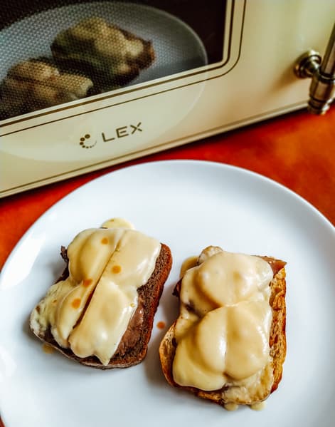 За полторы минуты на умеренно высокой мощности мы получили готовый завтрак, осталось добавить пару капель острого соуса для пикантности и цвета — нетронутому отсутствующим грилем сыру не хватало красок.