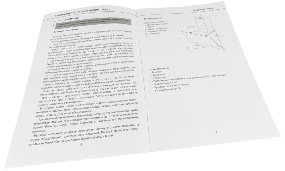 Вытяжка поставляется в большой коробке из «технического» (коричневого) картона, усиленной капроновыми стяжками. Несмотря на то, что упаковка предназначена лишь для того, чтобы прибор доехал до места назначения в целости и сохранности, оформлена упаковка довольно прилично и стильно.
