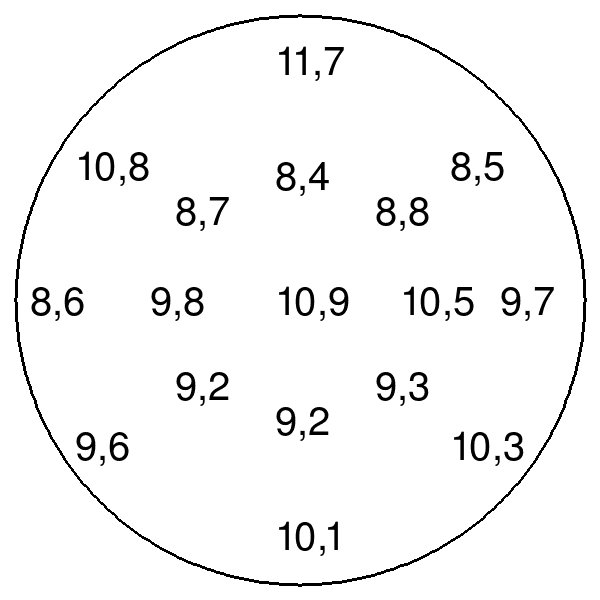 Исходя из полученной средней скорости вычисляется производительность вытяжки в кубометрах воздуха в минуту. Для этой модели результаты измерений выглядели следующим образом (цифры — скорость в метрах в секунду).