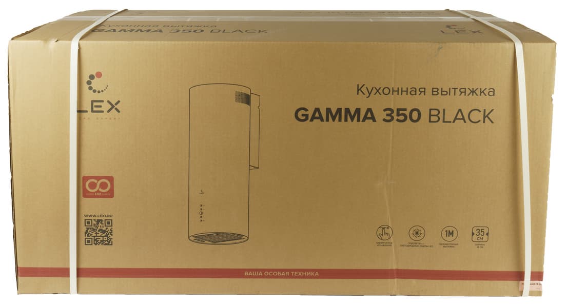 Вытяжка Lex Gamma 350 прибыла к нам на тестирование в большой картонной коробке, усиленной капроновыми стропами. На ее передней стороне мы видим векторное изображение устройства и QR-код, ведущий на сайт производителя.