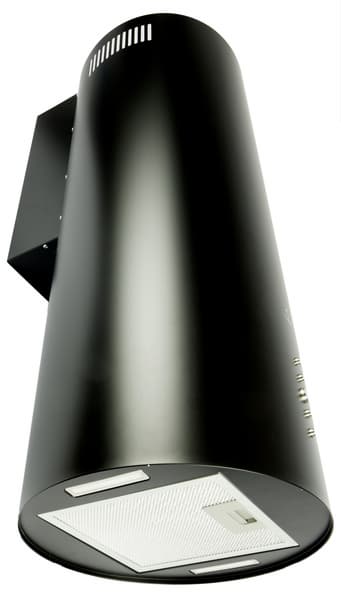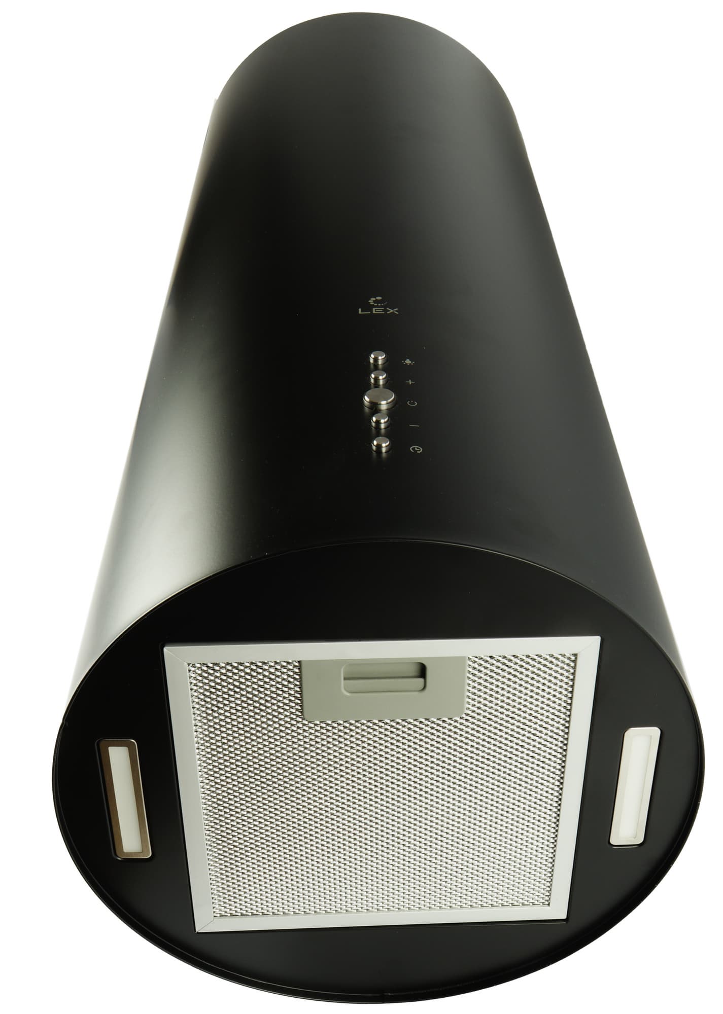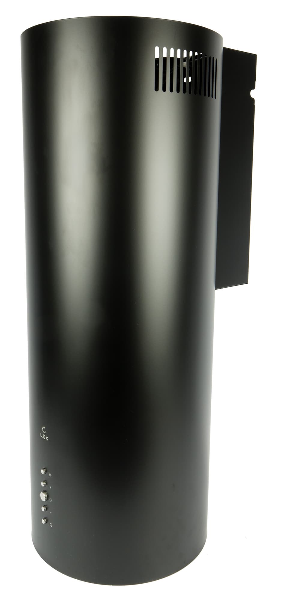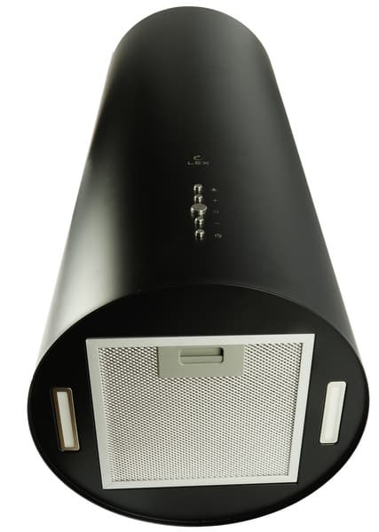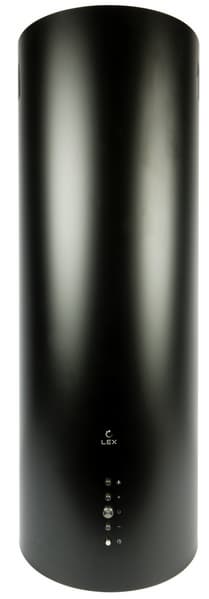 У вытяжки Lex Gamma 350 необычная конструкция и непривычный внешний вид: устройство представляет собой высокий (93 см) черный цилиндр (эту модель производитель предлагает также в белом цвете). Металлический корпус покрыт матовой краской, обеспечивающей легкий уход за поверхностью.