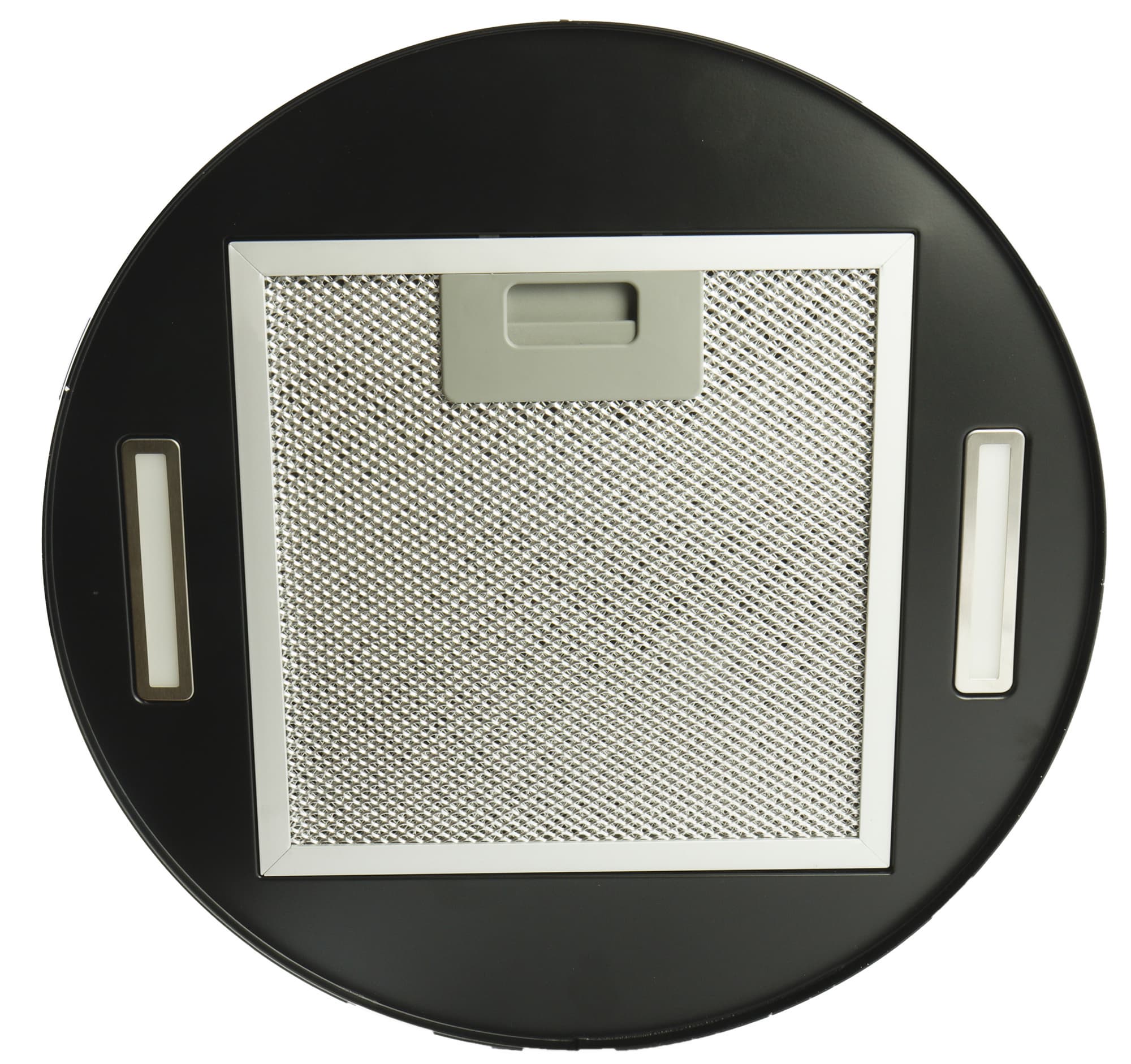 На круглой нижней стороне располагается алюминиевый жироулавливающий фильтр, справа и слева от которого установлены прямоугольные плафоны подсветки.