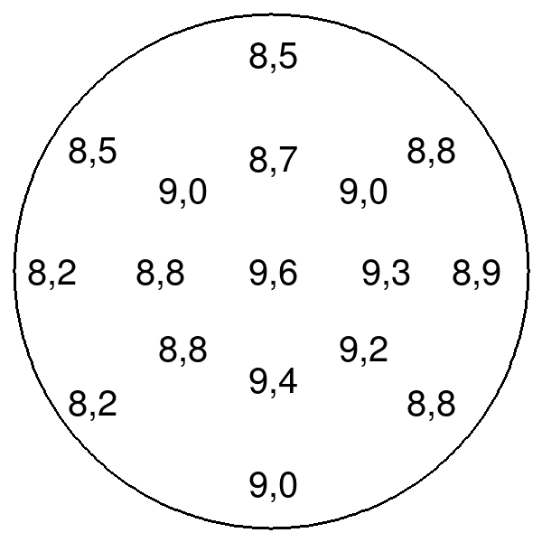 Исходя из полученной средней скорости вычисляется производительность вытяжки в кубометрах воздуха в минуту. Для этой модели результаты измерений выглядели следующим образом (цифры — скорость в метрах в секунду).