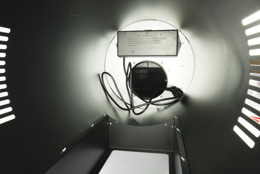 В прямоугольном коробе сзади цилиндрического корпуса проделаны продолговатые отверстия для подвешивания устройства. Чуть ниже предусмотрено окно для электрического кабеля, а большое отверстие можно использовать для вывода вентиляционного рукава.