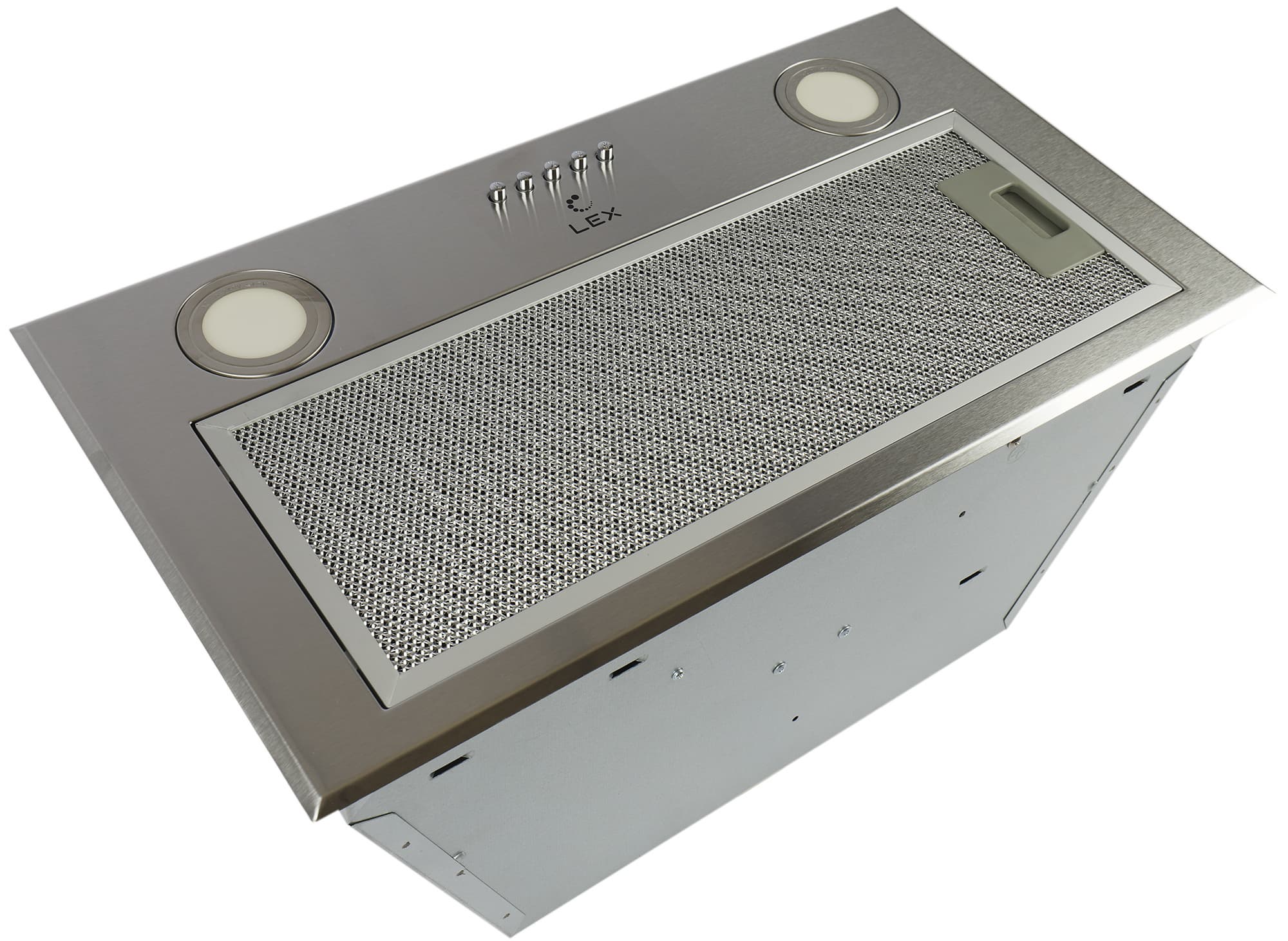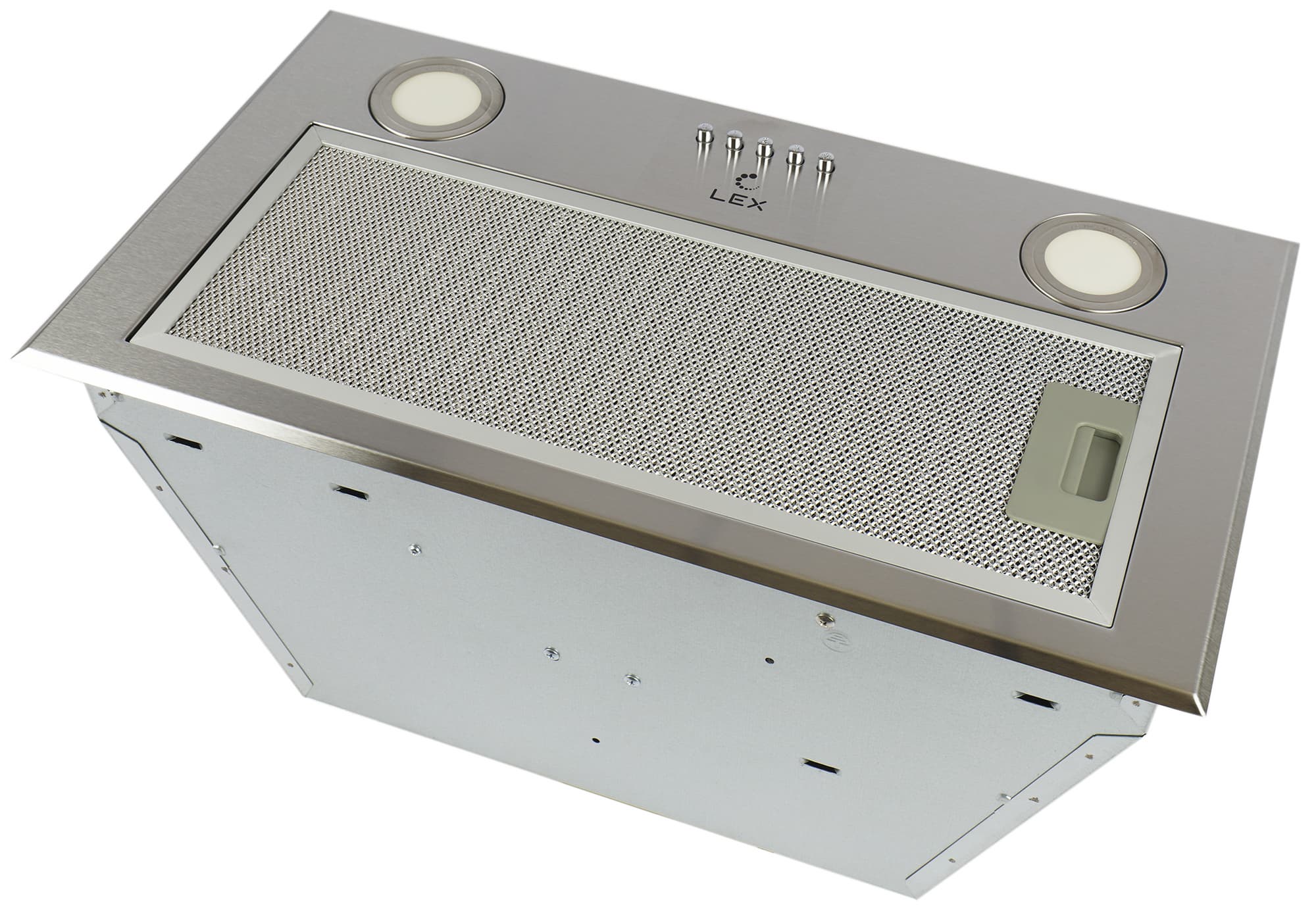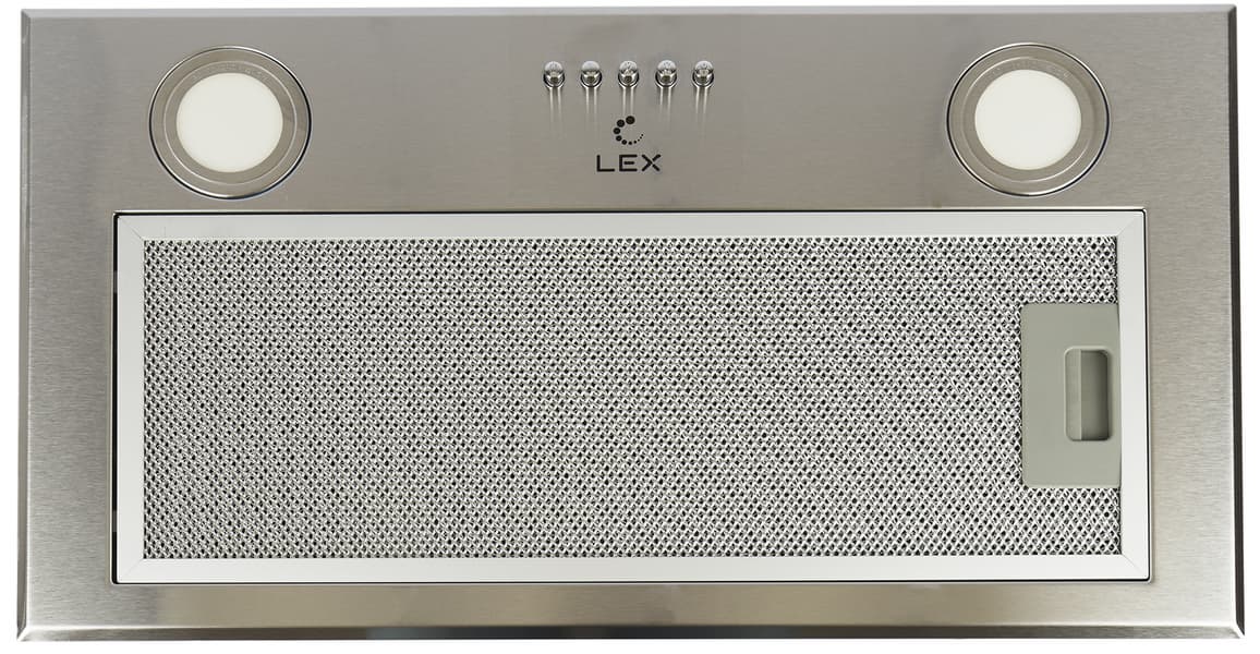 Lex GS Bloc P 600 Inox относится к классу полновстраиваемых кухонных вытяжек. Декоративными функциями обладает только нижняя панель из нержавеющей стали, а остальные детали корпуса должен скрывать надплитный шкаф.