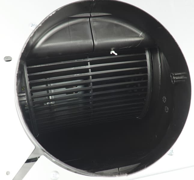 За решеткой фильтра располагается цилиндрический вентилятор в пластиковом корпусе. При использовании вытяжки в режиме рециркуляции, без подключения к вытяжному каналу, на оба его торца устанавливаются сменные угольные фильтры, впитывающие загрязнения и поглощающие запахи.