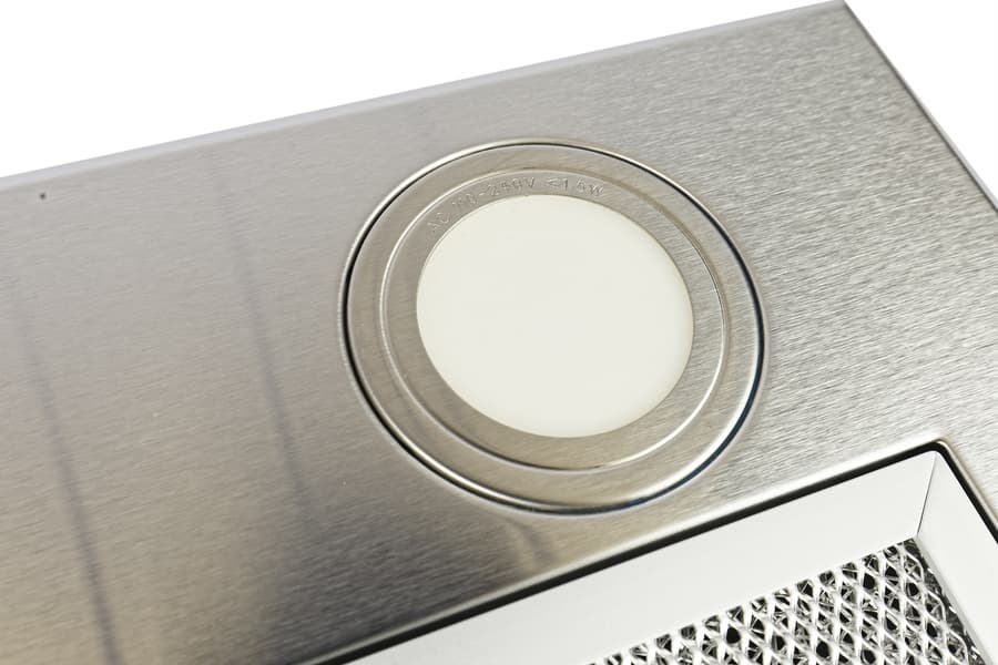 Две круглые лампы мощностью 1,5 Вт утоплены в корпус. В вытяжке использованы яркие светодиоды с холодным спектром.