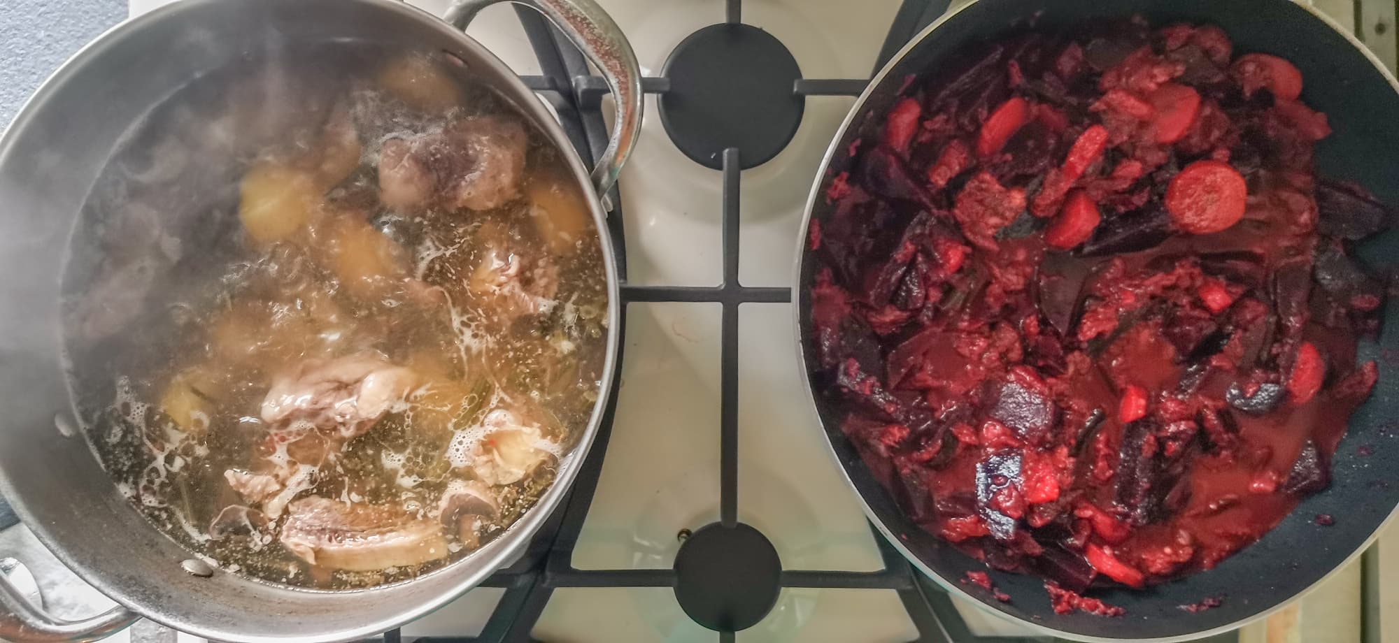 В 6-литровой кастрюле, установленной на вок-конфорку на минимум, мы сварили бульон из межреберной говядины. Параллельно с бульоном, в другой большой кастрюле мы отварили свеклу и морковь в кожуре. Почистили, порезали на сковородку диаметром 28 см и спассеровали в томатной пасте с нарезанными вялеными томатами.