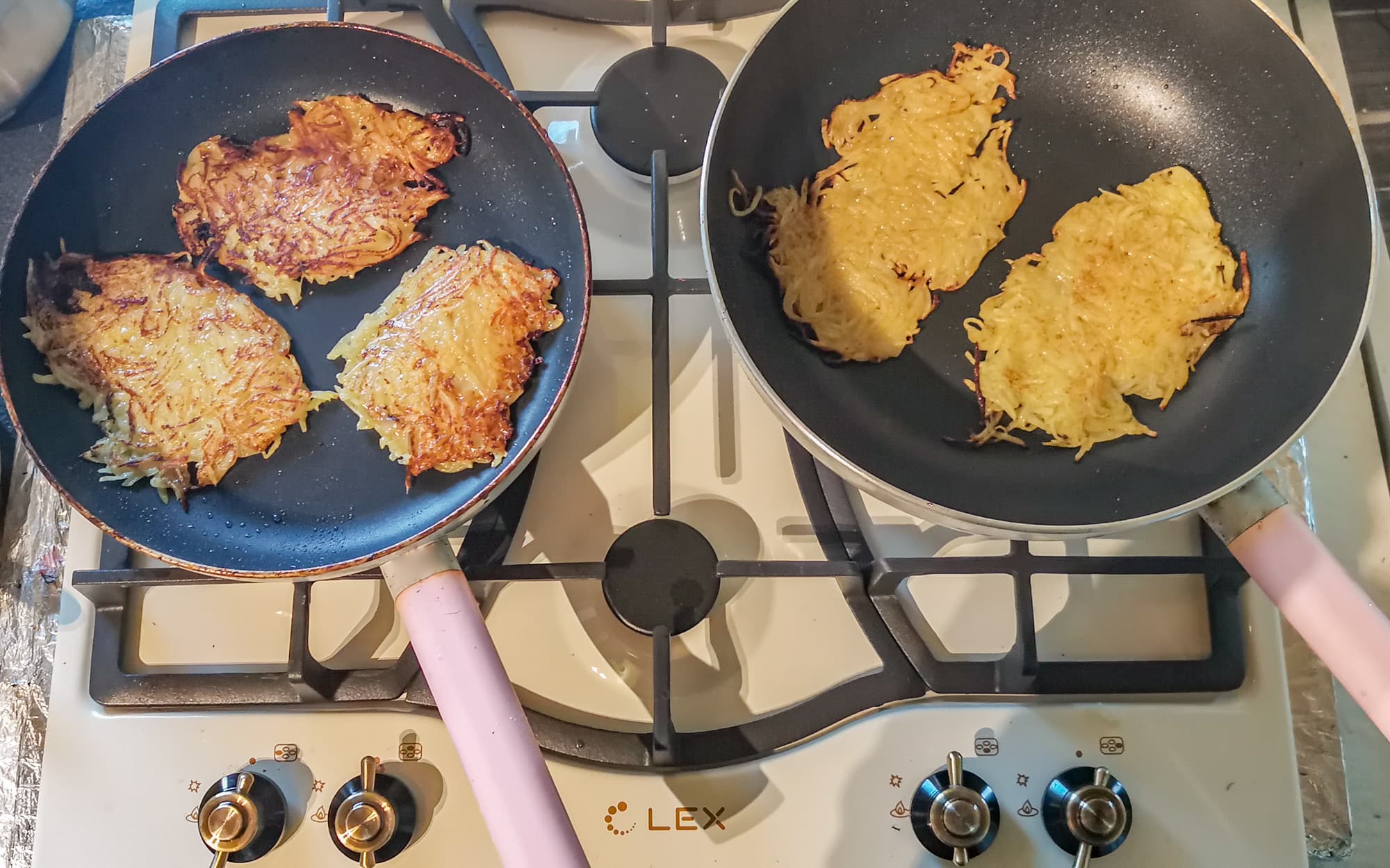 В мелко натертый картофель добавили яйцо, средний жарили без добавок. Готовили драники сразу на двух сковородках параллельно. Огонь пришлось поставить на допустимый минимум.