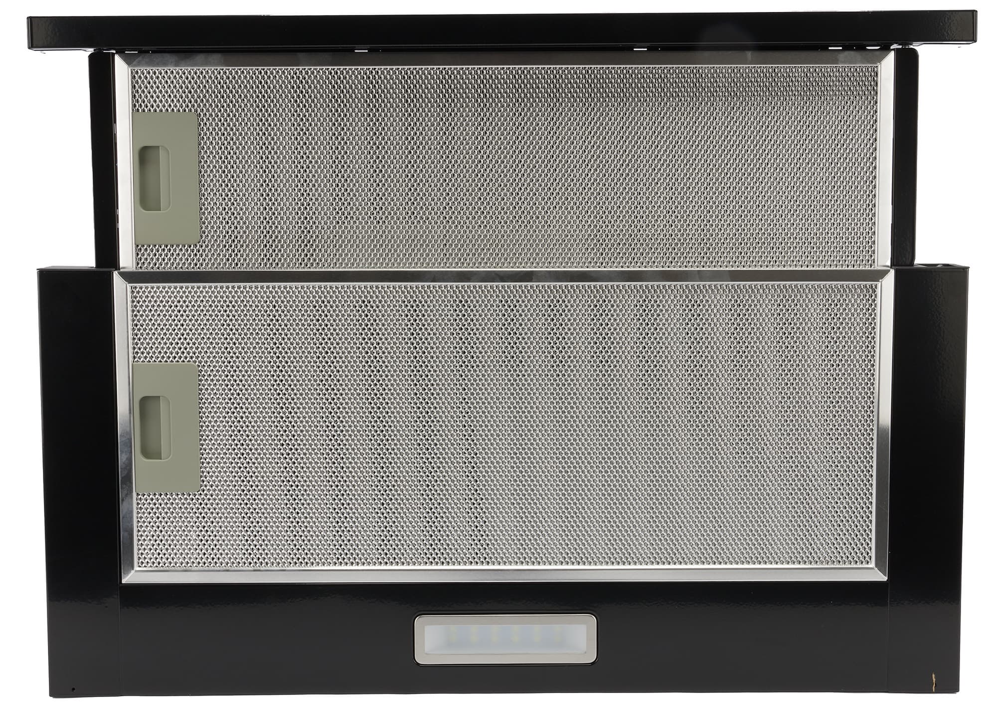 Еще на этапе распаковки мы определили, что перед нами — самая обычная, мы бы даже сказали, классическая встраиваемая телескопическая вытяжка. Правда, корпус у этой модели не «технический», а окрашен черной краской. Сам разработчик при этом указывает на возможность установки вытяжки без встраивания, в настенном формате. Таким образом, вытяжку можно смонтировать и так и этак — либо встраивая ее в кухонный гарнитур, либо просто повесив на стену. В обоих случаях к пользователю устройство будет обращено нижней стороной.