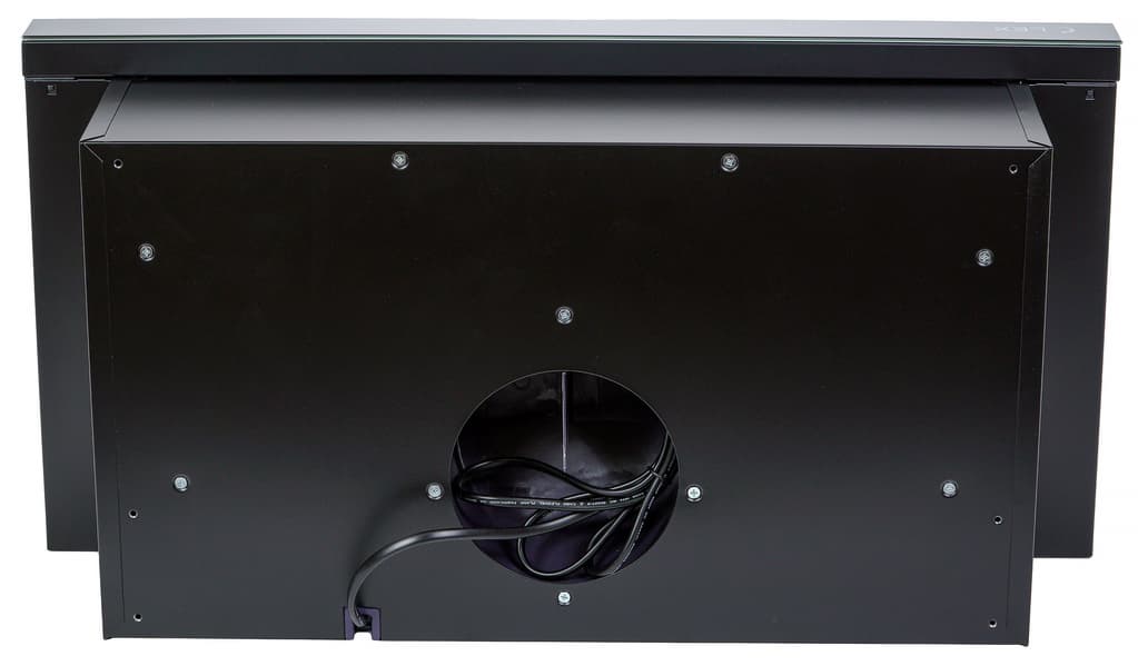 Верхняя часть прибора лишена каких-либо декоративных элементов, здесь есть только отверстие для вентиляционной трубы. Перед нами вытяжка, которую можно и встроить, и поставить как отдельно стоящую.