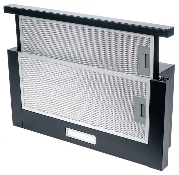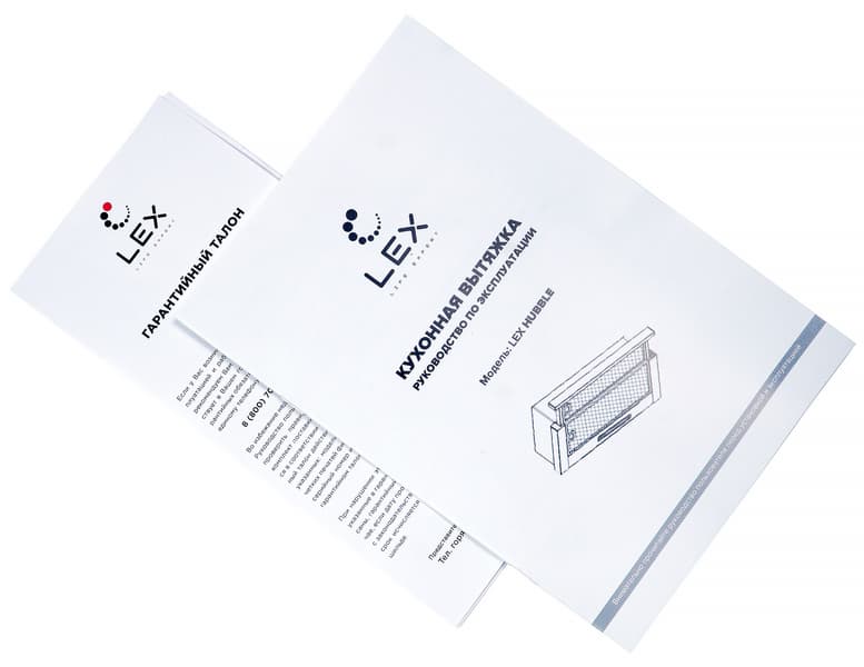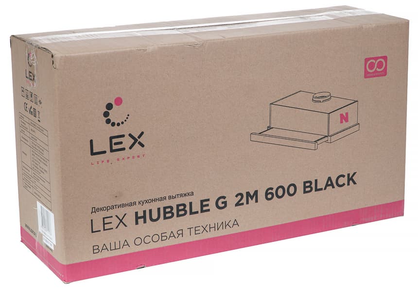 Lex Hubble G 600 — горизонтальная вытяжка с выдвигающимся вперед дополнительным фильтром, который чуть меньше основного. Лицевая сторона подвижной панели отделана стеклом черного цвета с логотипом производителя. Никаких других надписей (в том числе и номера модели) на корпусе нет.