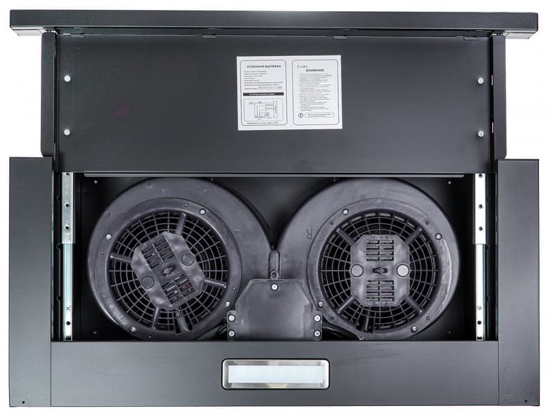 За решетками фильтров размещаются два вентилятора в пластиковых корпусах. В случае, если устройство не подключается к вытяжной вентиляции, а работает в режиме рециркуляции, здесь также размещаются опциональные угольные фильтры (их можно купить отдельно).