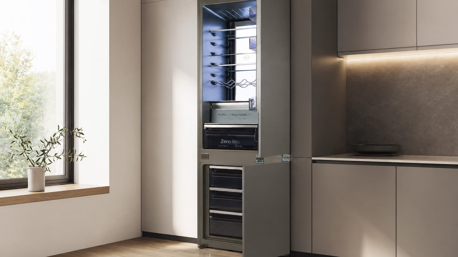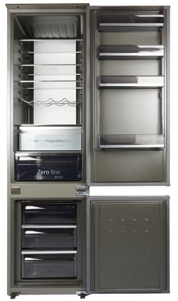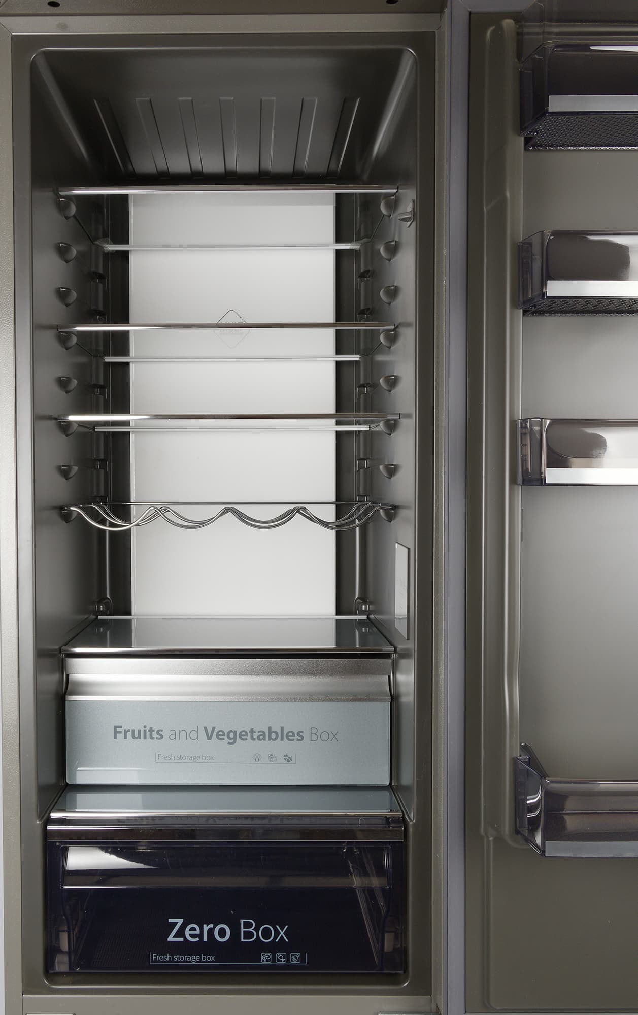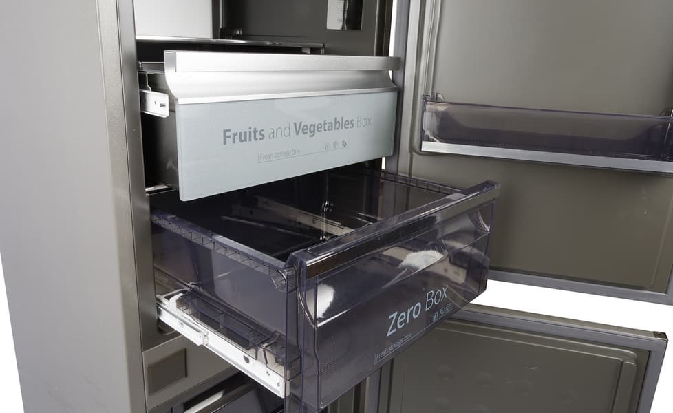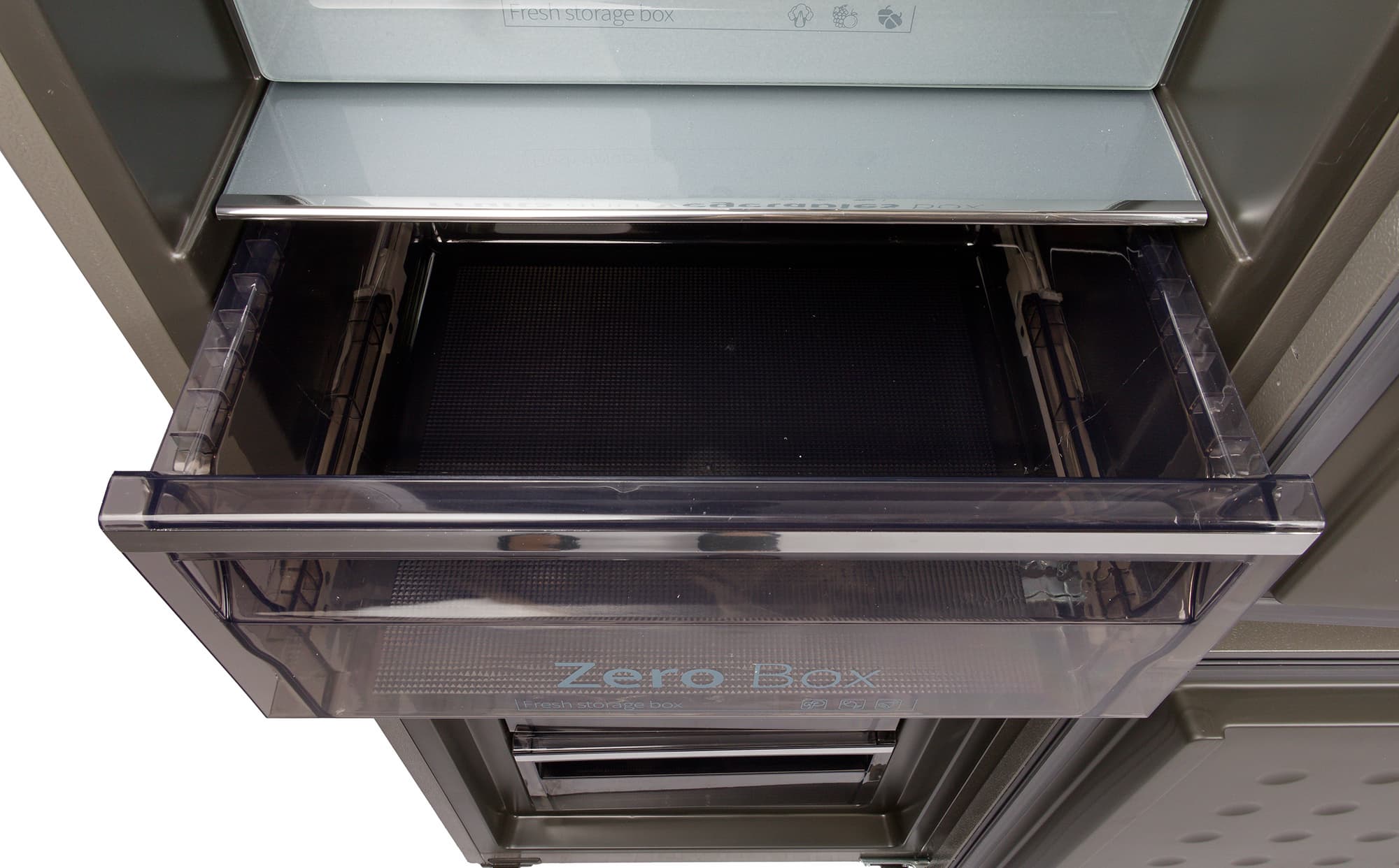 Благодаря изолированной конструкции и возможности отдельной регулировки температуры фреш-зона делает холодильник фактически трехкамерным при сохранении стандартной двухдверной встраиваемой конструкции. В ящике Zero Box можно хранить как свежие, так и замороженные продукты, использовать эту зону как дополнительную емкость для овощей и фруктов или применять ее для бережной разморозки.