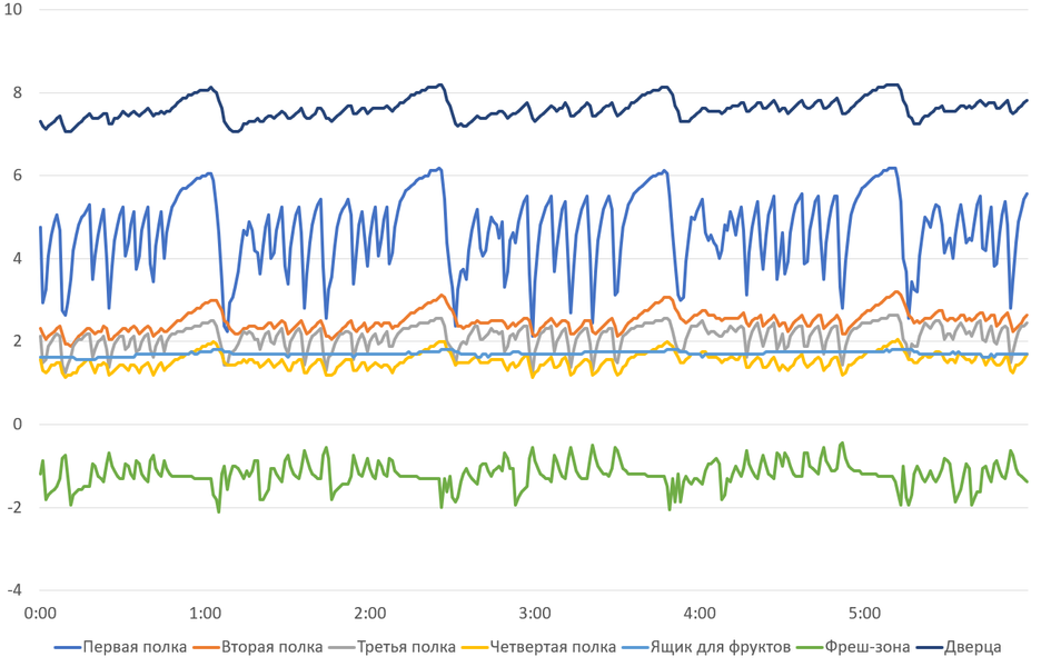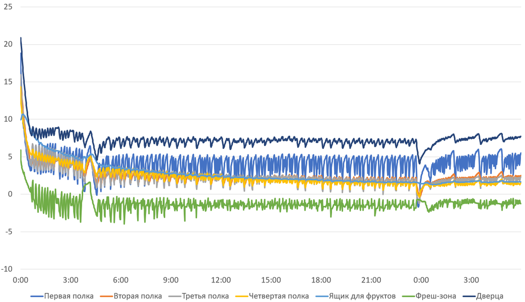 Считаем необходимым еще раз подчеркнуть, что приведенные графики иллюстрируют не потребительские качества холодильника, а особенности логики работы холодильного агрегата и циркуляции холодного воздуха между зонами камеры. Не следует удивляться таким, на первый взгляд, существенным колебаниям: охлажденные продукты обладают значительно большей тепловой инерцией, нежели воздух в камере, и переносят циклические изменения температуры нормально.