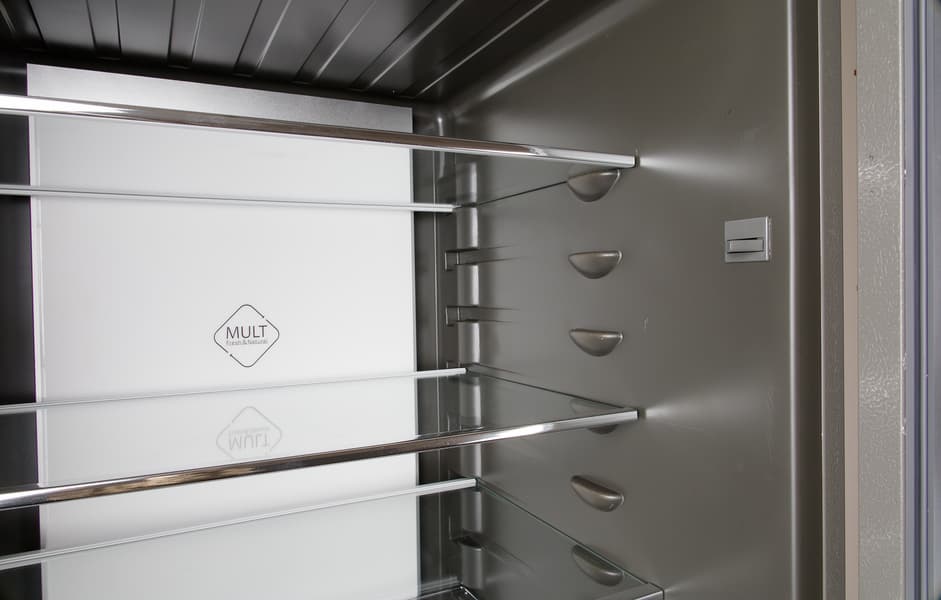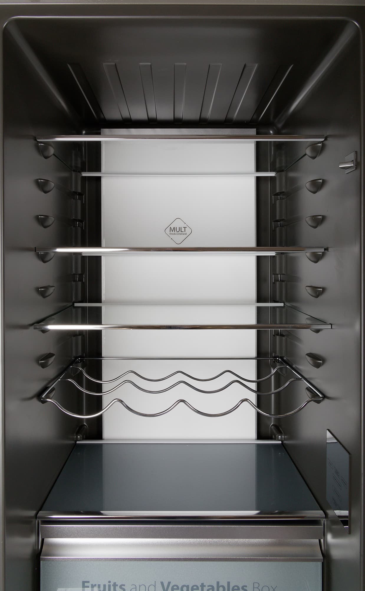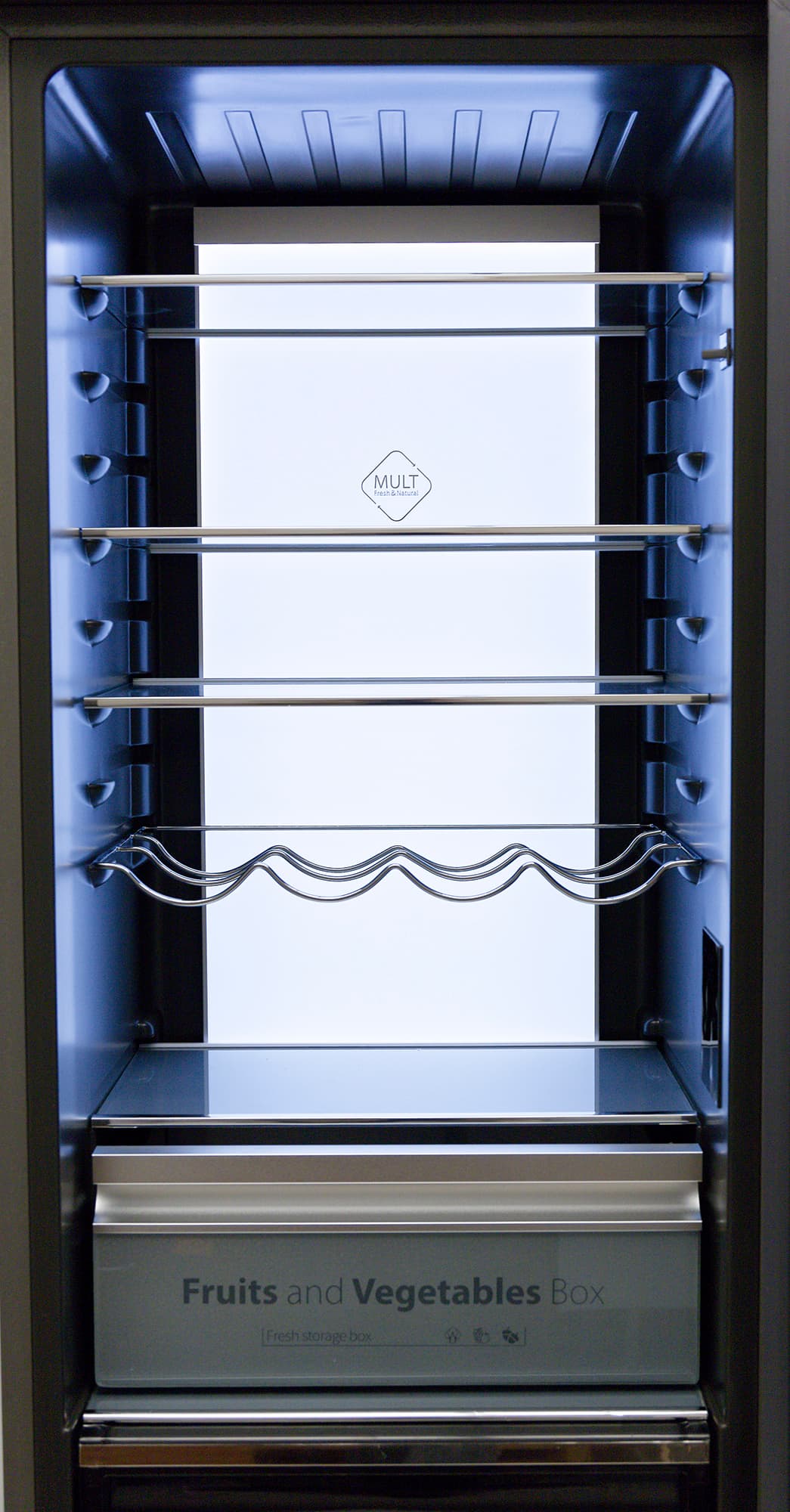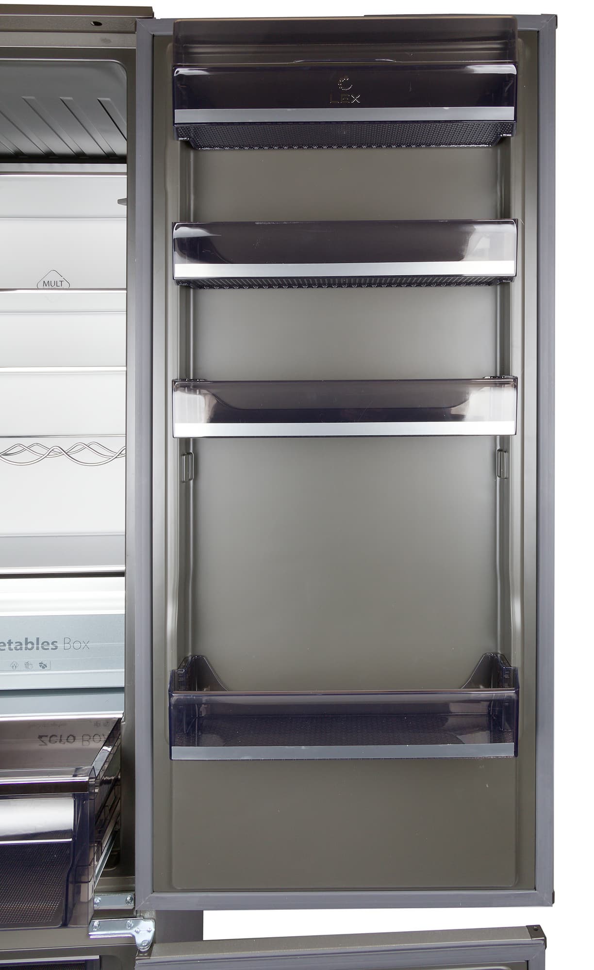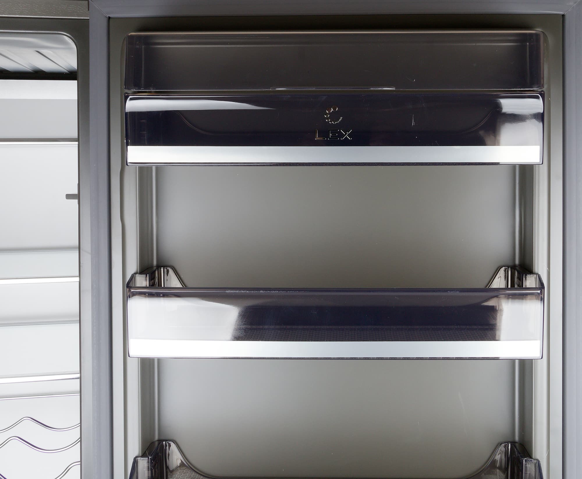 Первое, что бросается в глаза при открытии холодильника — цвет отделки холодильной и морозильной камер. В отличие от подавляющего большинства холодильных устройств Lex LBI193.3ID серый не только снаружи, но и изнутри. Удачное сочетание серого цвета с металлической отделкой кромок и белыми стеклянными панелями смотрится очень необычно, стильно и, что называется, дорого.