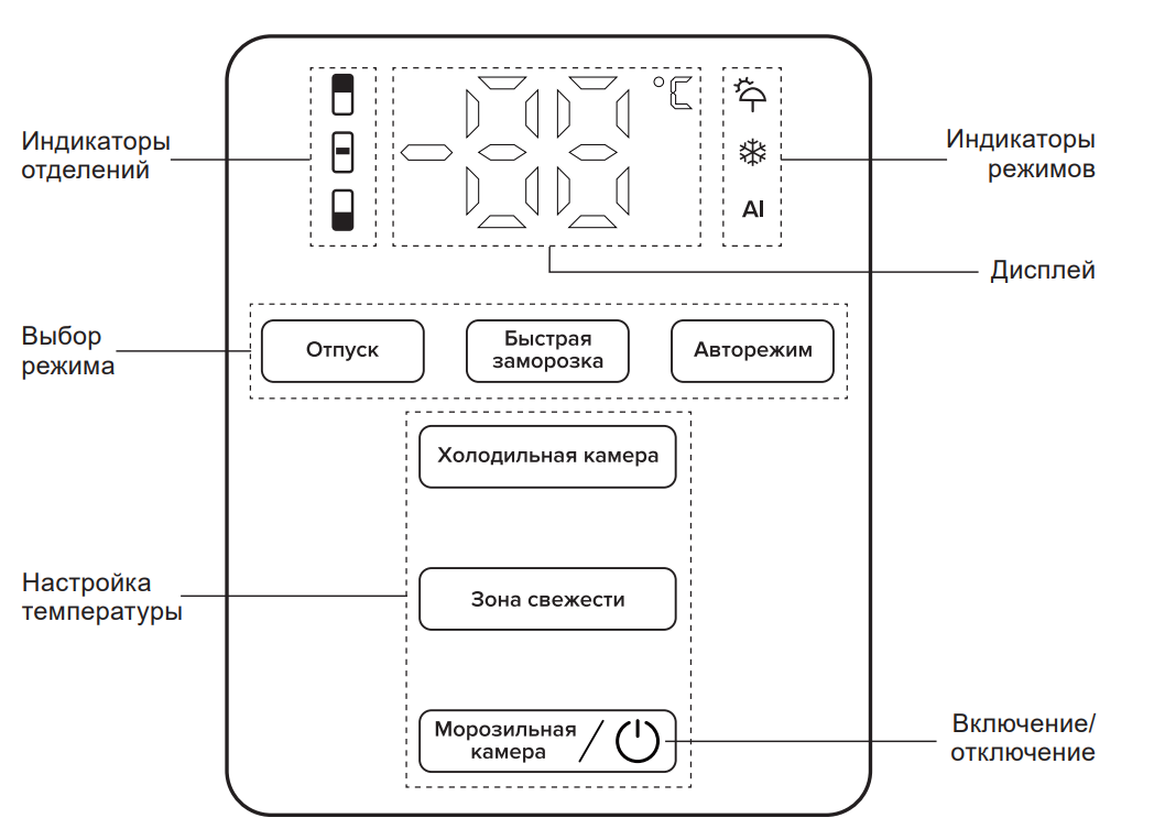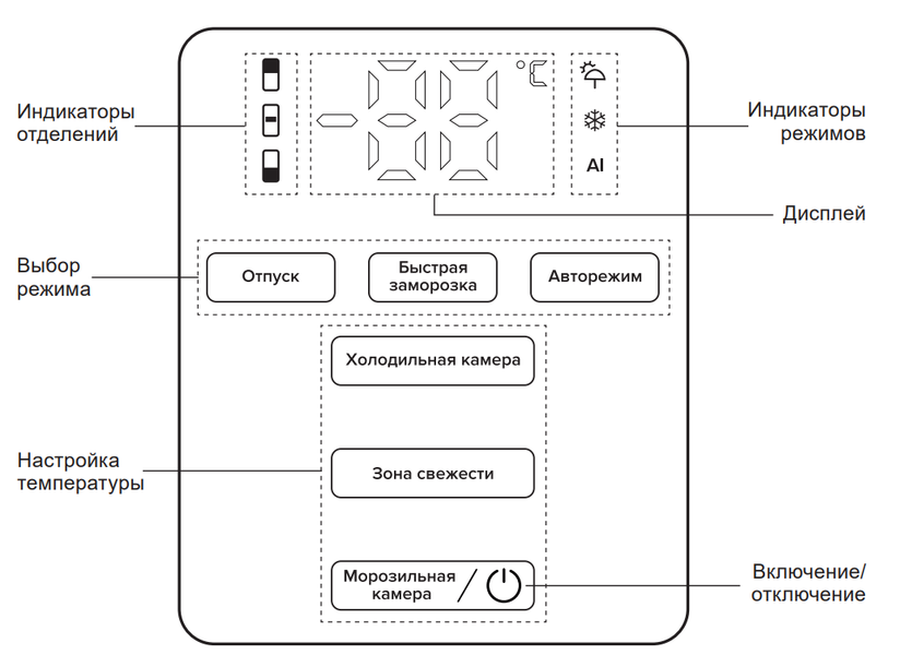Интерфейс пользователя состоит из светодиодного экрана и шести сенсорных кнопок, управляющих температурой и режимами работы. Эта модель позволяет настраивать температуру в основном холодильном отделении, зоне свежести и морозильной камере. За выбор зоны отвечают три вертикальных сенсора в нижней части панели.