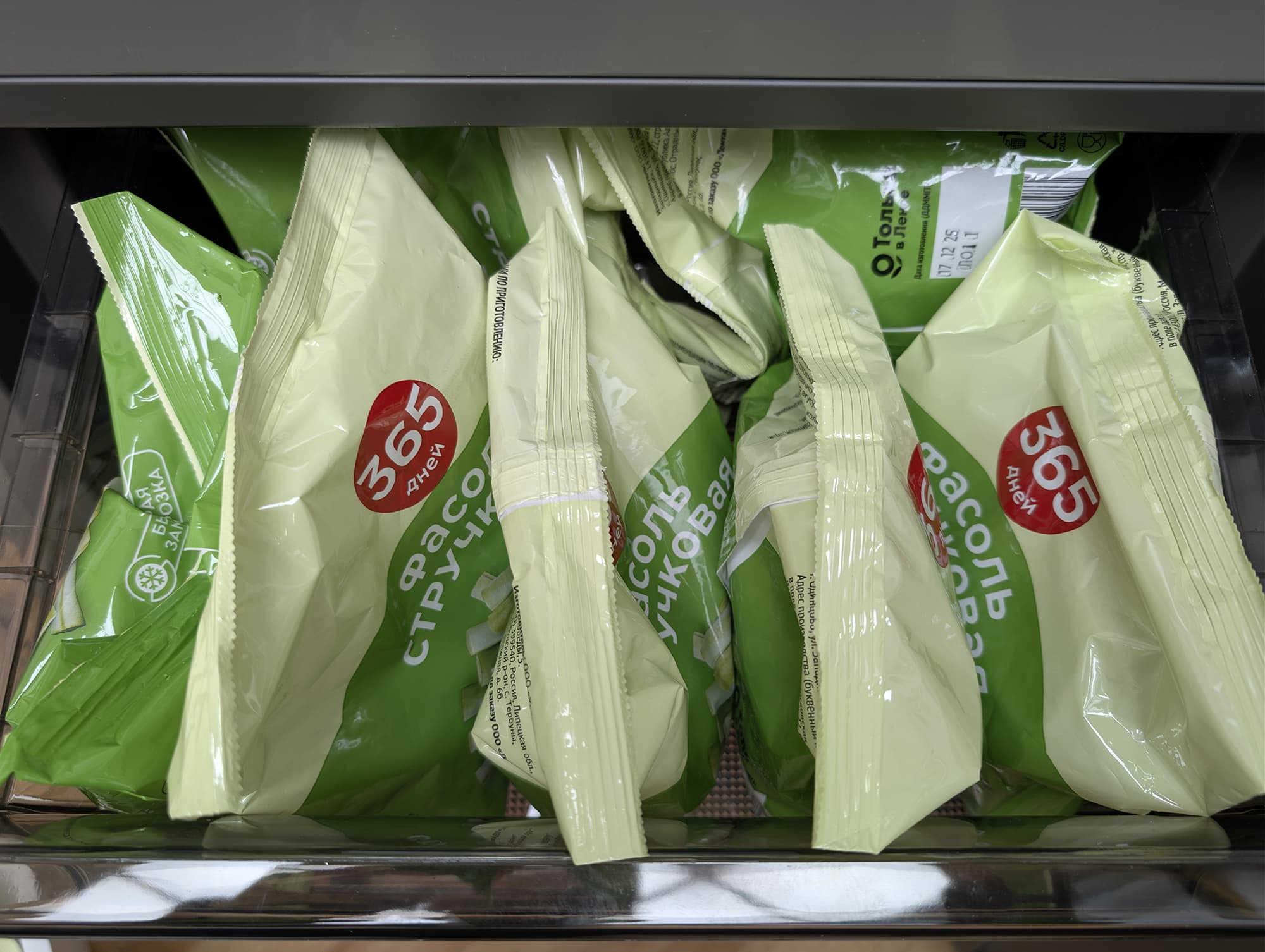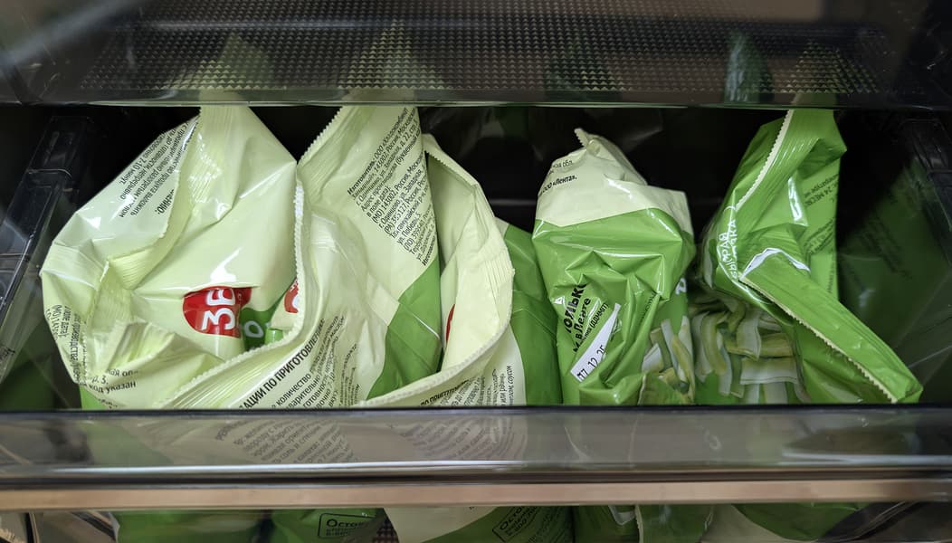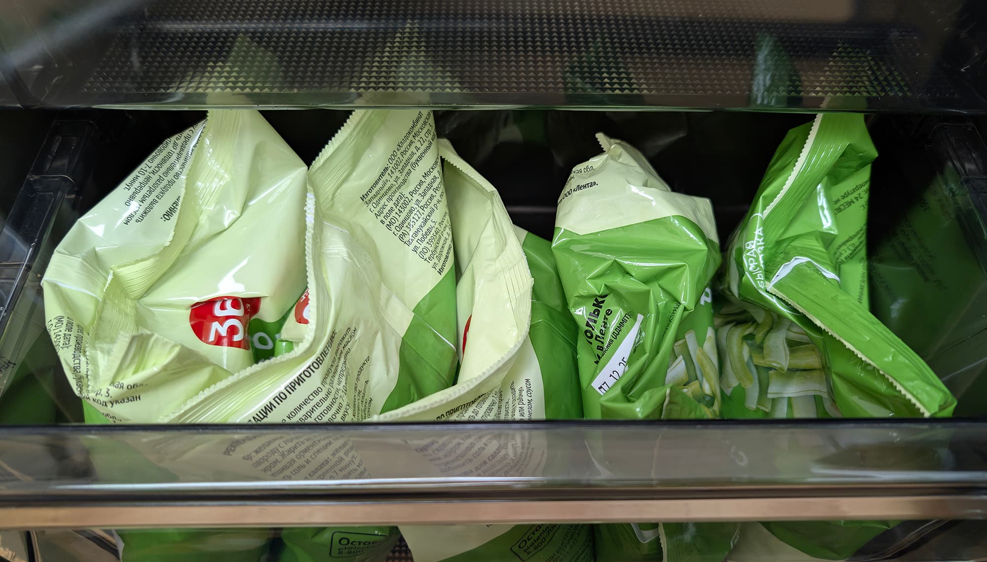 Для оценки емкости ящиков морозильной камеры мы традиционно используем стандартные 400-граммовые пакеты с замороженными овощами. В два верхних контейнера без труда помещается по семь упаковок: две вдоль и пять поперек.