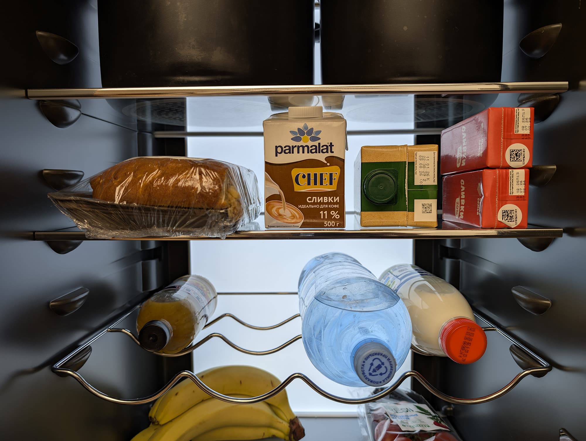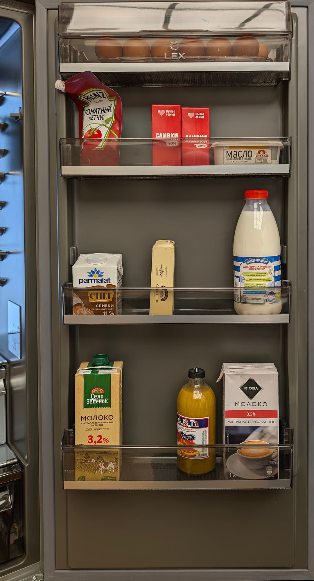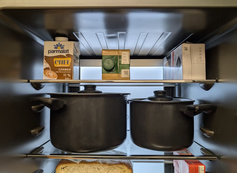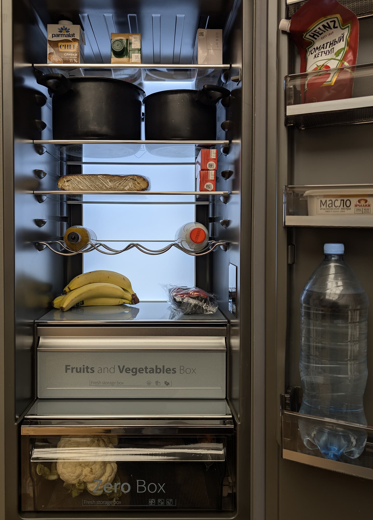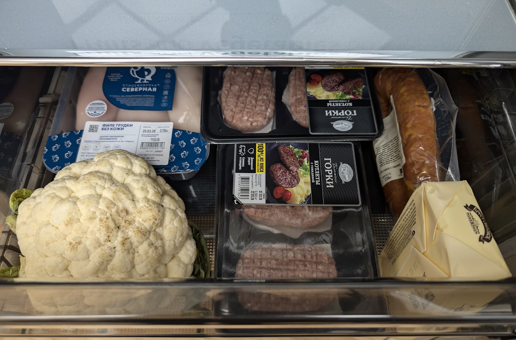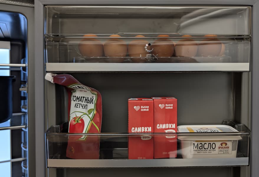 Объем нижнего ящика чуть меньше за счет расположенного за ним холодильного агрегата: сюда влезает только пять стандартных упаковок.