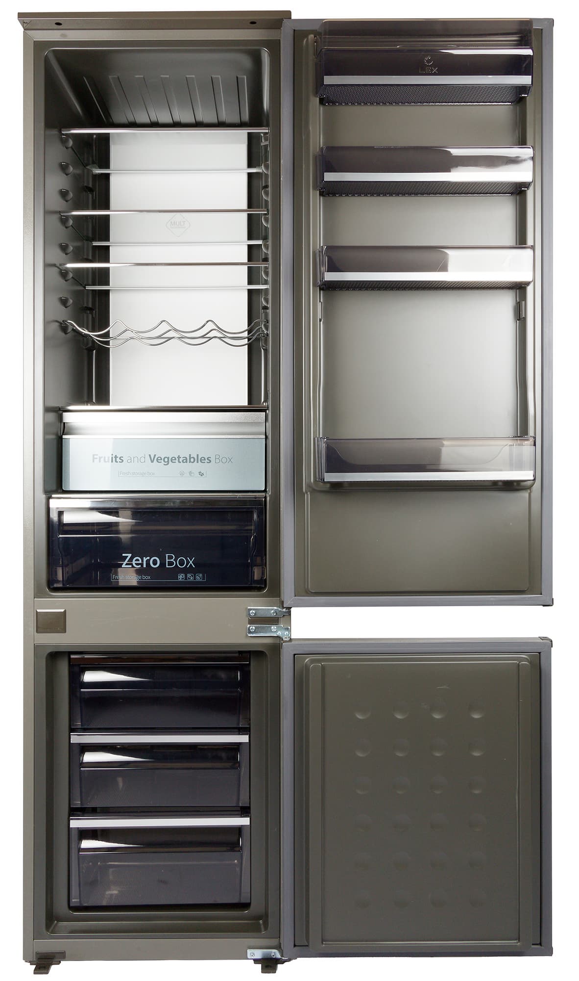 Встраиваемый холодильник Lex LBI193.3ID Grey понравился нам оригинальным привлекательным дизайном и современной эффективной конструкцией. Самое яркое впечатление при знакомстве с устройством производят необычный цвет внутренней поверхности, стильная светодиодная подсветка задней панели холодильной камеры, ящик для овощей из нержавеющей стали и наличие зоны свежести Zero Box.