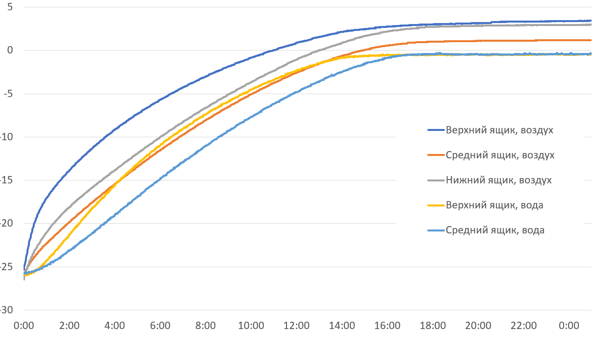 Чтобы оценить замораживающую способность холодильника, мы поместили по контейнеру с водой комнатной температуры на первую и четвертую полки морозильной камеры, третий контейнер разместили в верхнем ящике, после чего включили режим максимального охлаждения. Результаты измерений температуры воды и воздуха можно видеть на графике ниже.