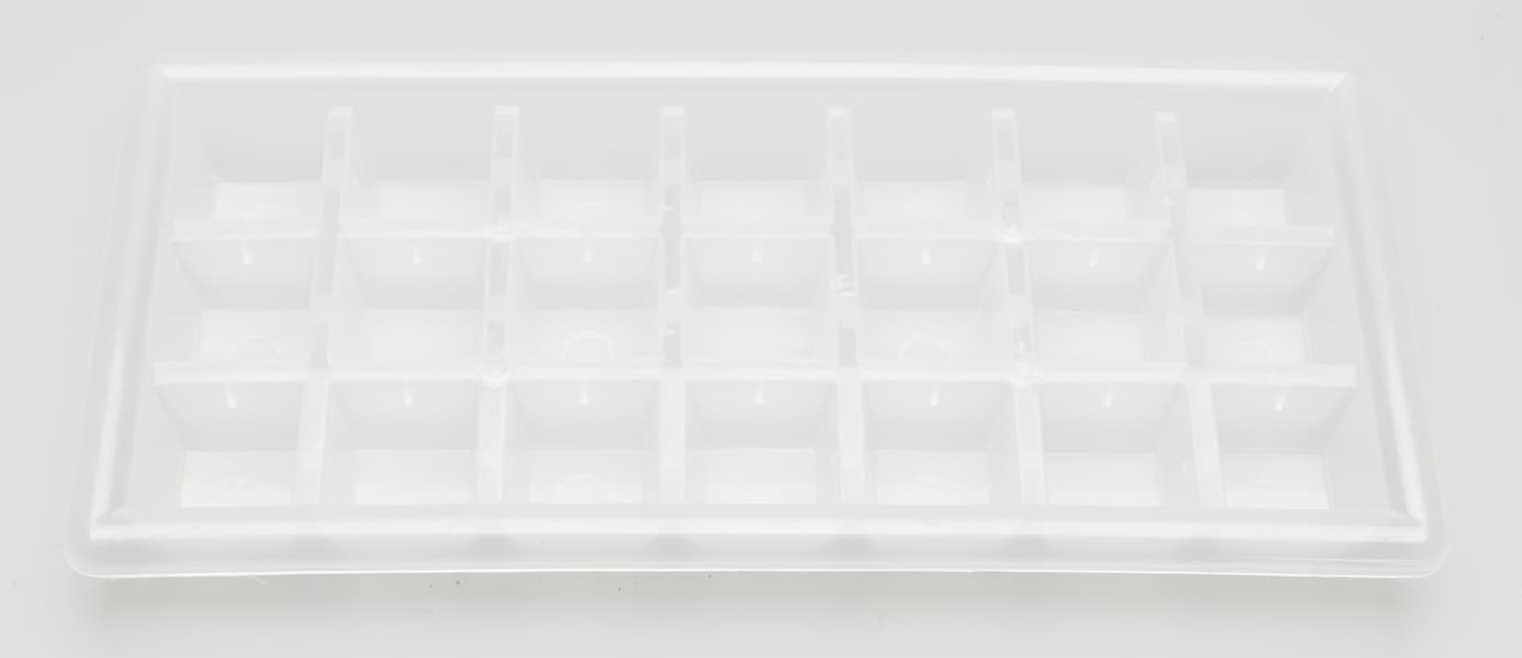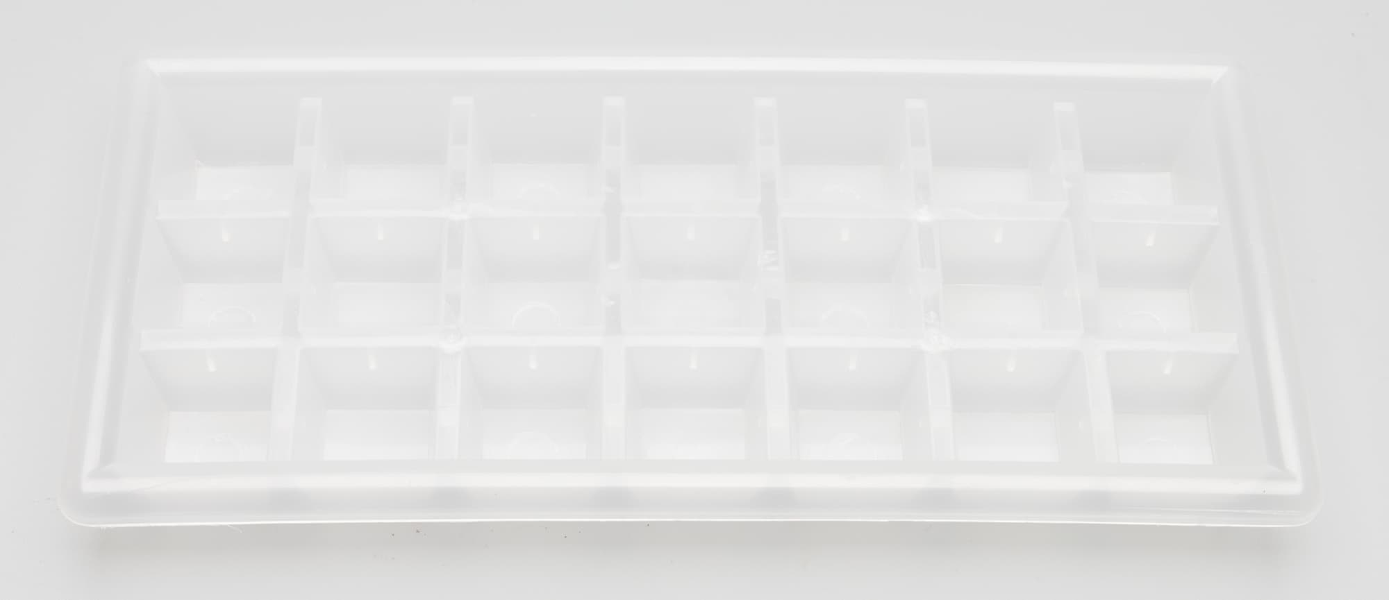 Входящий в комплект прибора традиционный контейнер для льда сделан из белого пластика и рассчитан на 21 кубик: три ряда по семь штук.