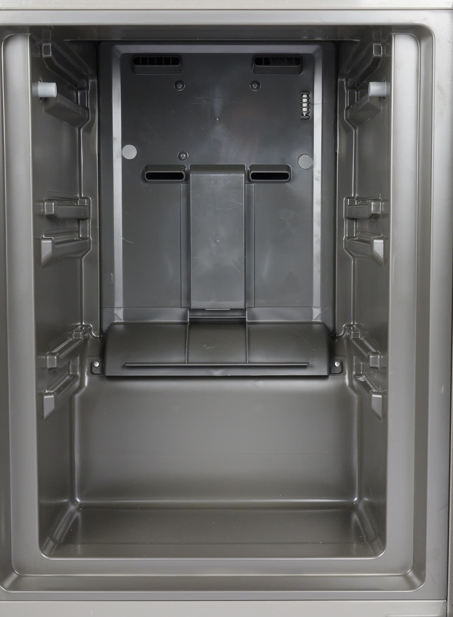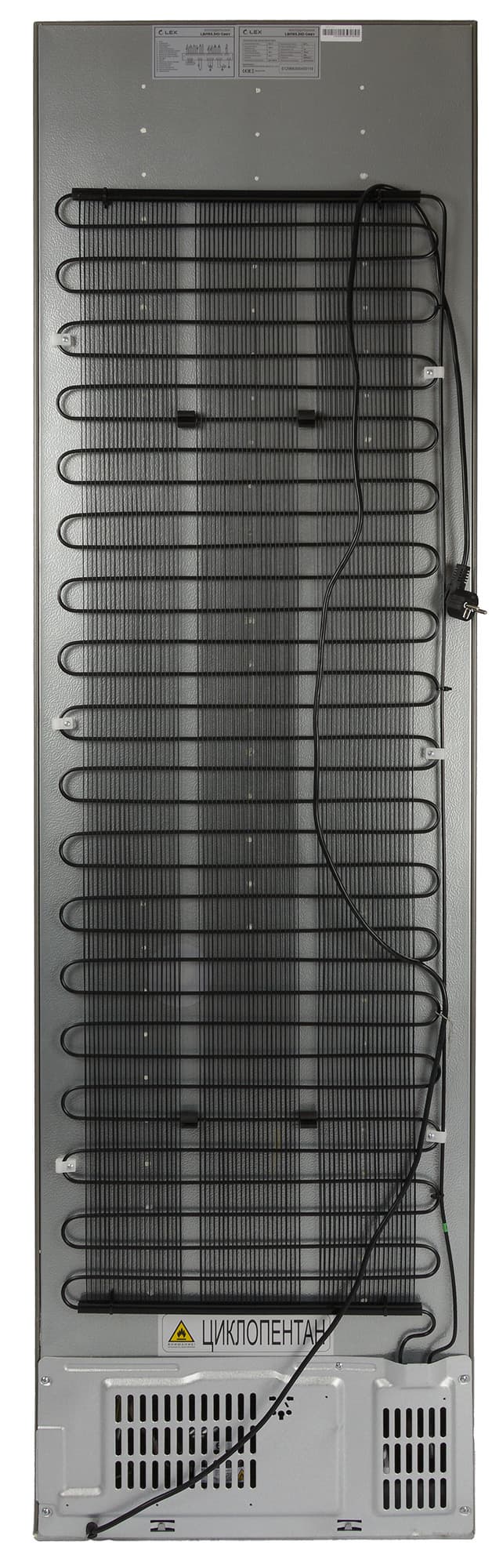 Теплообменник у Lex LBI193.3ID Grey открытого типа. Решетка расположена на задней стенке, а под ней за алюминиевой панелью скрывается отсек компрессора.