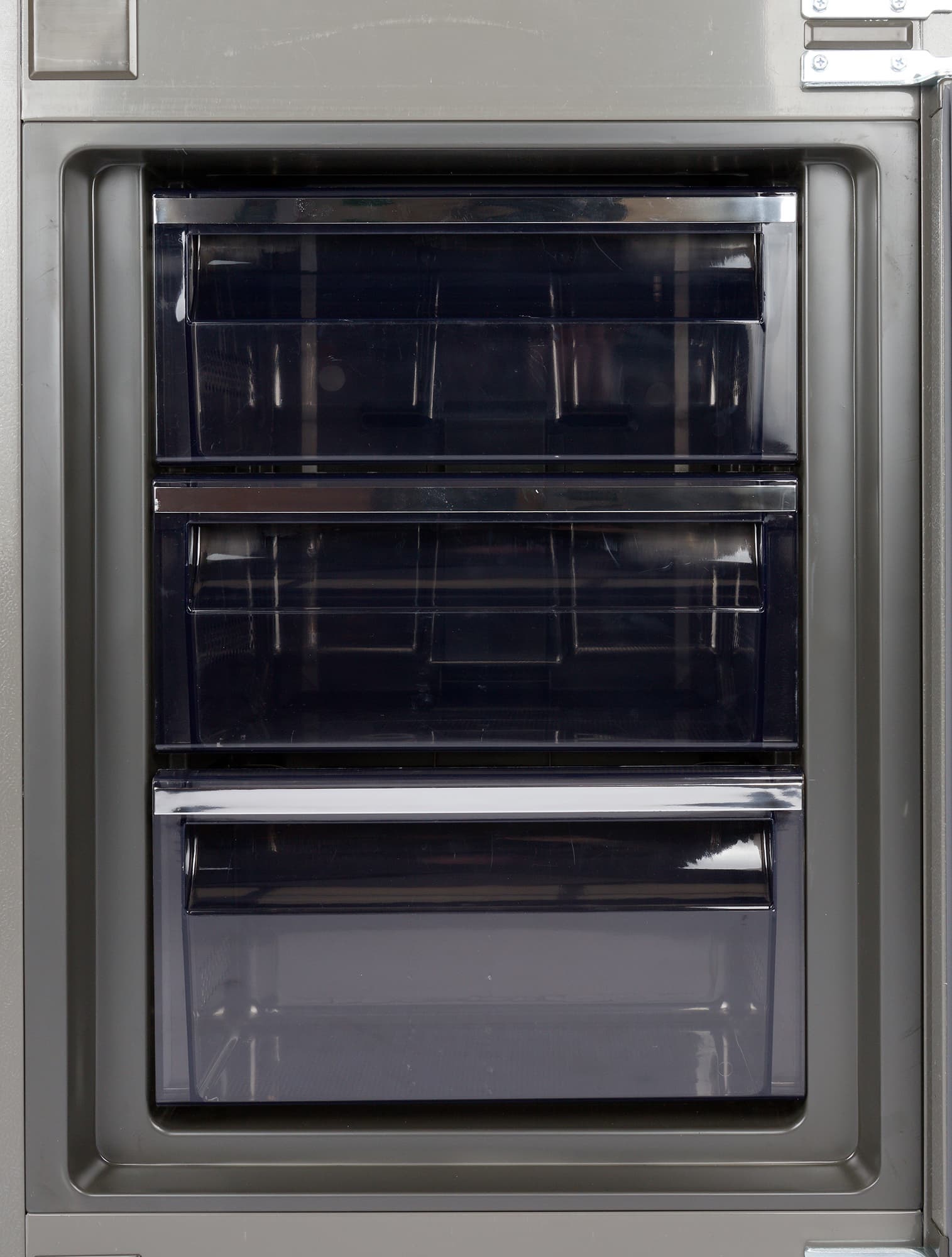 Перед нами — встраиваемая двухкамерная модель с классической компоновкой: холодильное отделение располагается в верхней части корпуса, морозильное — снизу.