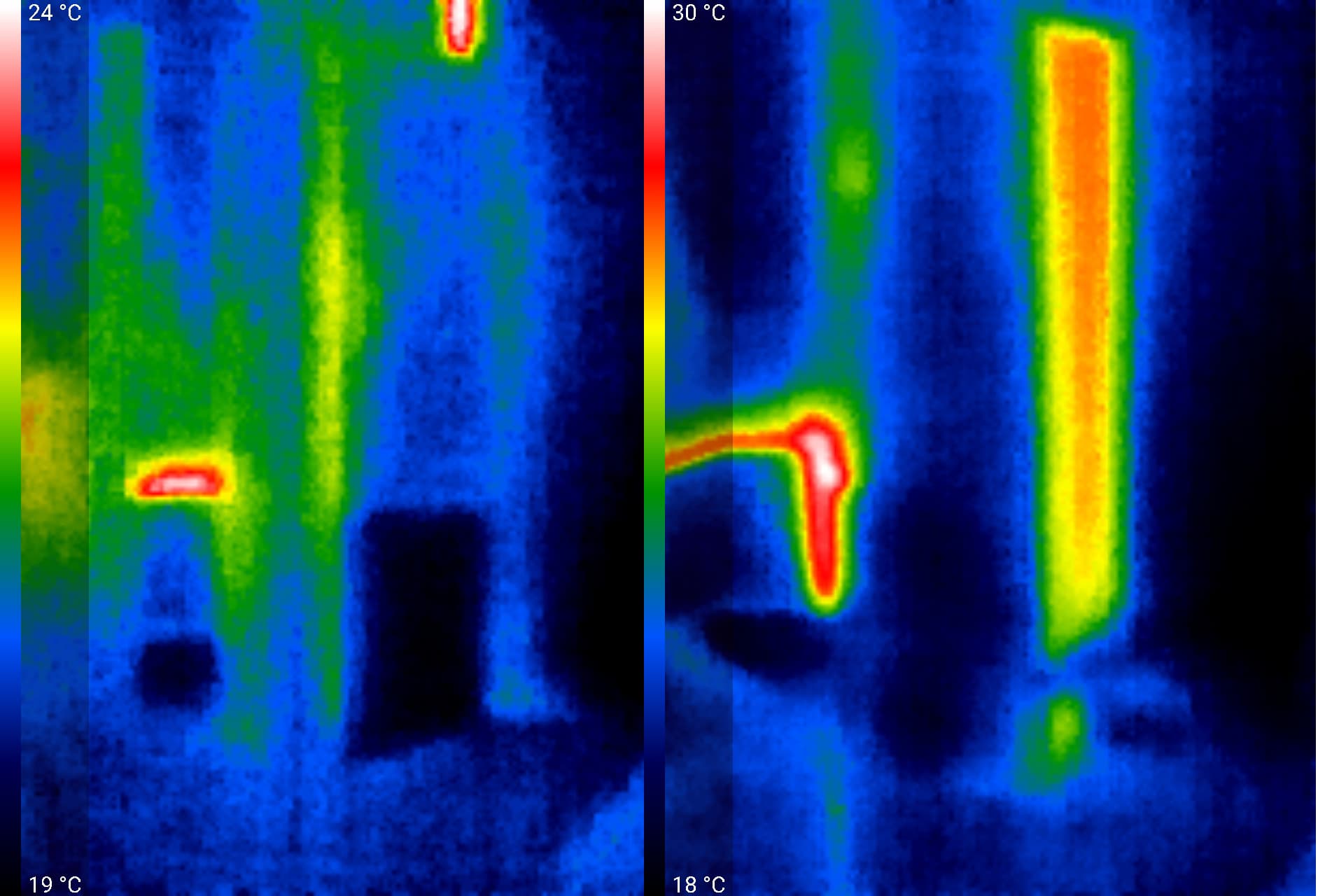Стенки холодильника не слишком сильно нагреваются при работе: это иллюстрируют фотографии включенного устройства в инфракрасном диапазоне. На фото можно видеть, что температура решетки на задней стенке не превышает 25—28 °C. Металлический кожух, за которым скрывается компрессор, оказался еще холоднее за счет принудительной вентиляции отсека.