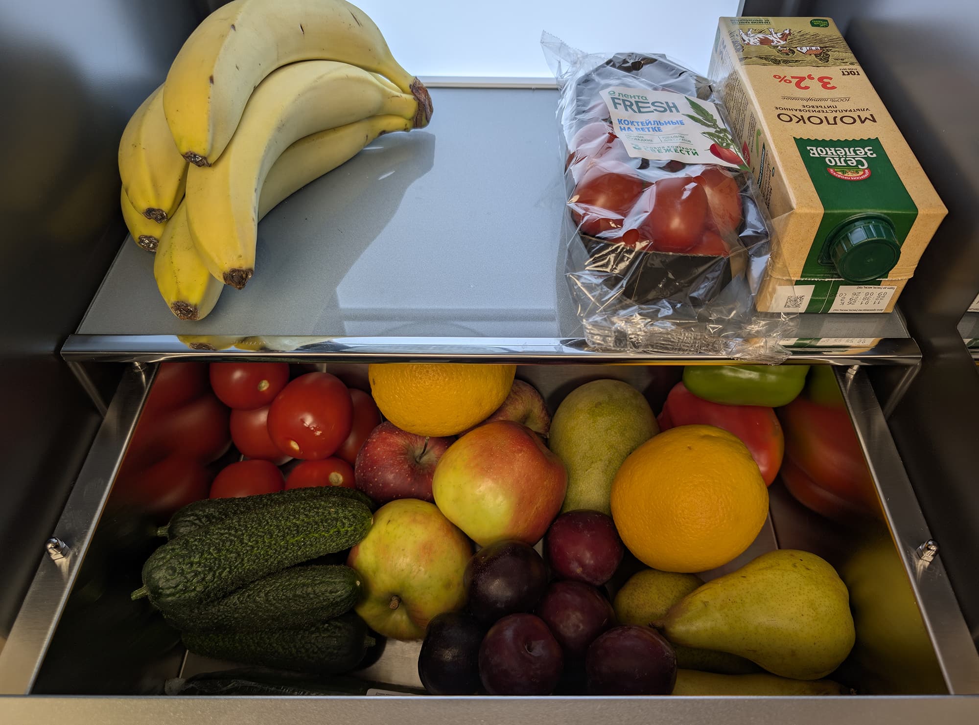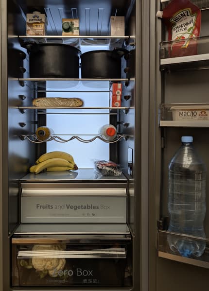 В ящике для овощей и фруктов — наиболее ровный микроклимат. Перепады температуры здесь почти незаметны: конструкция и материал контейнера позволяют сохранять зелень, фрукты и овощи свежими. В ящике фреш-зоны, как и полагается, поддерживается легкая минусовая температура.
