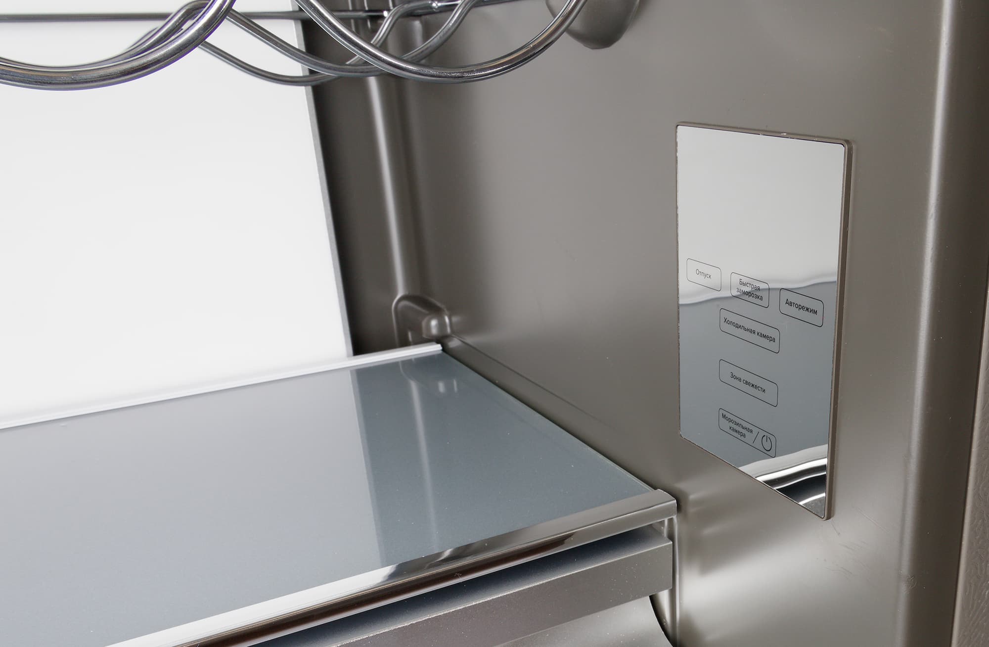 На правой стенке камеры расположены механический датчик открытия двери и зеркальная панель управления со светодиодной индикацией. Зеркальное стекло здесь выглядит современно и интересно, но надписи на панели читаются с трудом даже при пустом холодильнике.