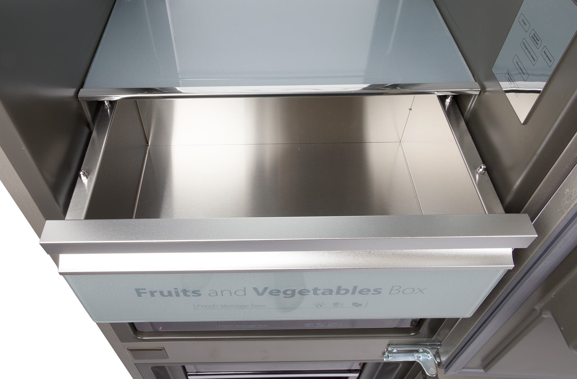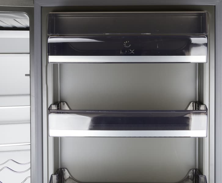 В нижней части холодильного отделения располагаются два ящика. Верхний сделан из нержавеющей стали с белым стеклянным фасадом: он предназначен для овощей и фруктов.
