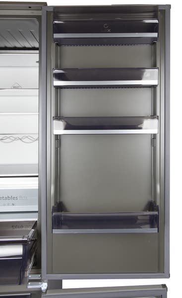 На дверце холодильного отделения — четыре съемных полки из темного прозрачного пластика с металлической отделкой. У трех их них фиксированное размещение, а четвертая (третья сверху) допускает установку в двух положениях: повыше и пониже.