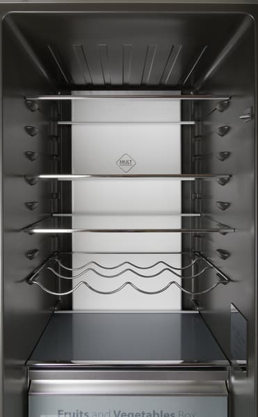 В основном объеме камеры — четыре полки из закаленного стекла и металлический держатель для бутылок. Нижняя полка служит одновременно и крышкой ящика для овощей и фруктов.